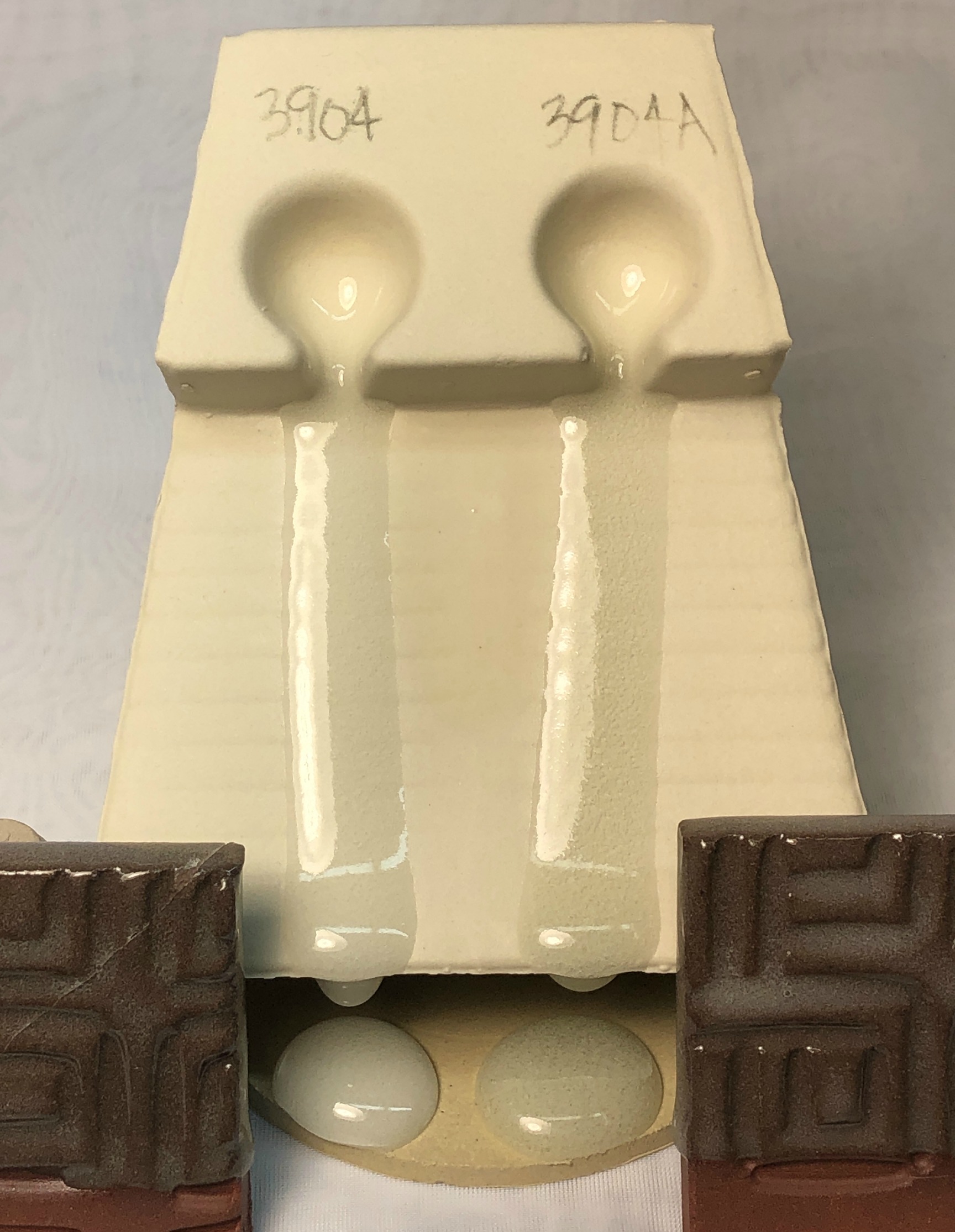 These were fired using the drop-hold-slow cool schedule. Fired behaviour almost the same. The A is more transparent and runs a little more. It is applied a little thicker on the tiles so has more bubbles.