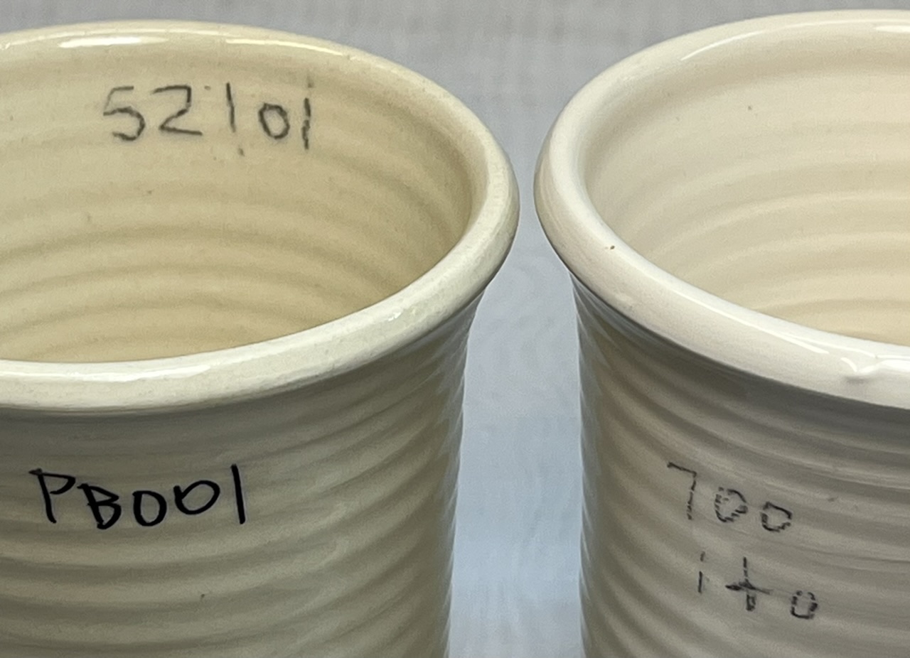 No crazing out of the kiln on any of them (these of some of the many recipe tests we did before settling on the P version). This is a testament to how good of a glaze the Spectrum 700 is. It fires more transparent (therefore whiter) than the others and fits better. L4410 after several days soaking in water