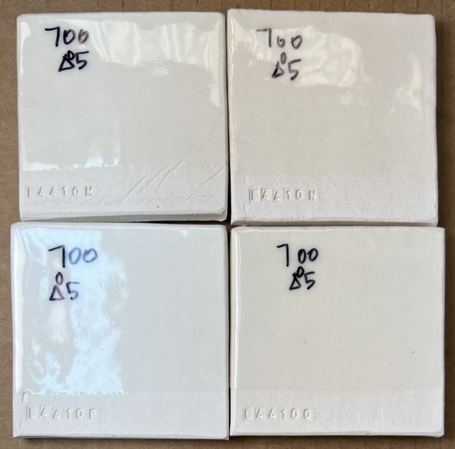 Fired cone 05. No crazing after weeks on any of them. The 700 glaze fires much whiter than the Duncan or Mayco on this body (it must be using a higher quality frit). Spectrum 700 on L4410M, N, P, Q - Cone 05