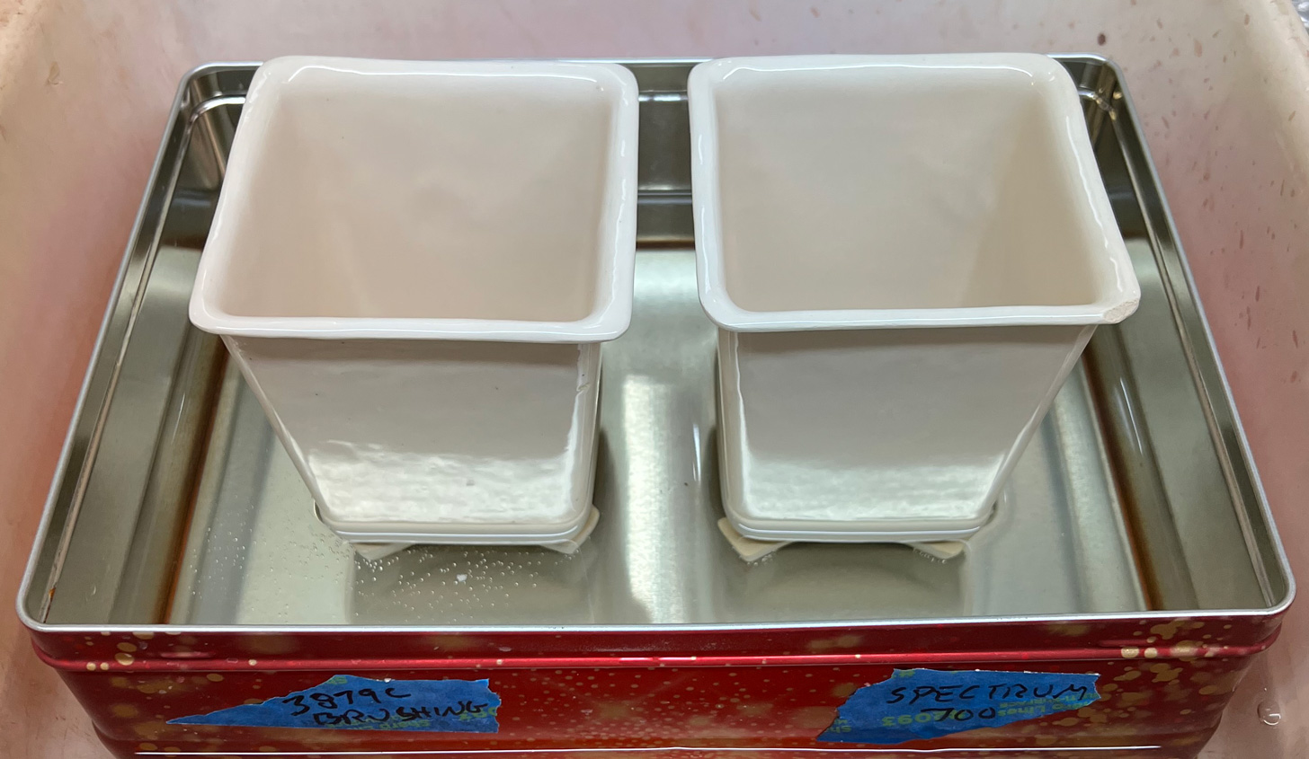 The water as wicked up the walls (between the glazed inner and outer surfaces). After several days there is no crazing with Spectrum 700 or L3879C. L4410P at cone 05 with Spectrum coloured glazes