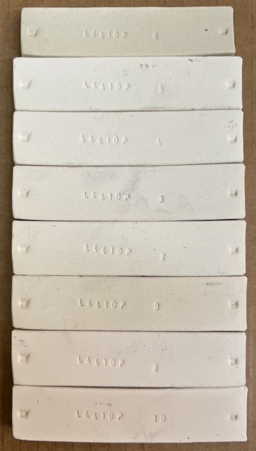 These are Plainsman Snow (the L4410P recipe) cast pieces with L3685Z7 stained engobe on the upper sections. The four sides have been clear glazed with Mayco S-2101, Duncan PB001, Amaco LG-10 and Spectrum 700 transparent glazes. The left half of each has an extra glaze layer, that has not made much difference in any of them. The S-2101 transmits the brown color best, the LG-10 and PB001 a little less. The 700 is decidedly lighter, it is altering the brown color (likely MgO in the glaze is reacting with the stain). However, over the white body, the 700 is by far the best, being crystal clear and glassy smooth. The lower halves of these also demonstrate something equally interesting: The ones that don't alter the brown do react with the MgO in the white body, yellowing it and turning opaque. The lesson is to try various brands of clear glazes over underglaze decoration and colored engobes, especially with dolomite-based low fire bodies. It might even be advantageous to use one brand on the insides of pieces and another on the engobe or slip-decorated exteriors. L3685Z7 engobe vs Plainsman Snow BiClay bars