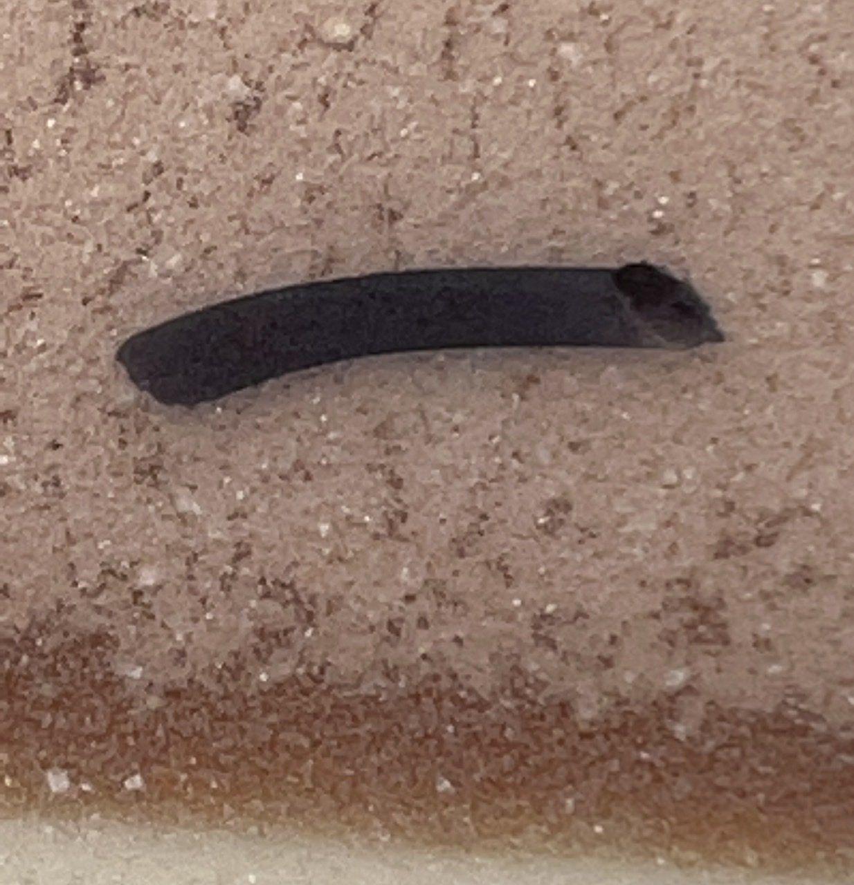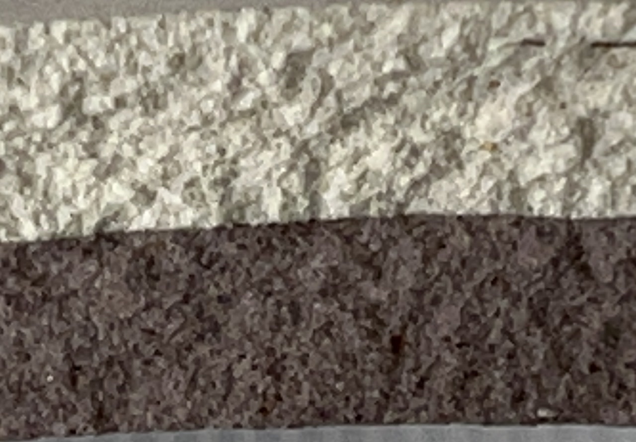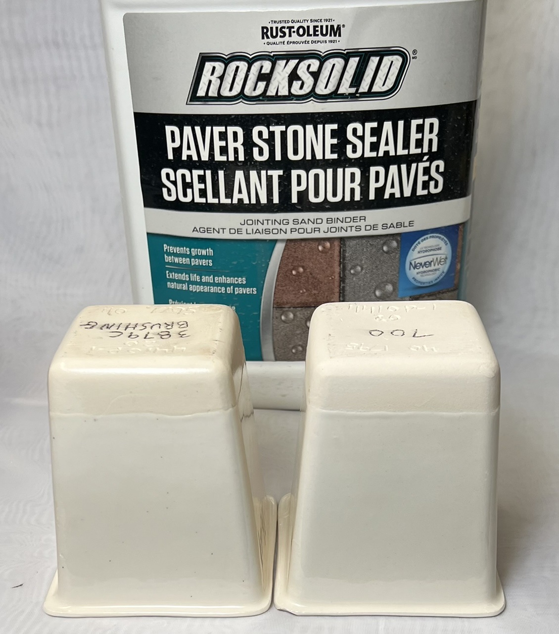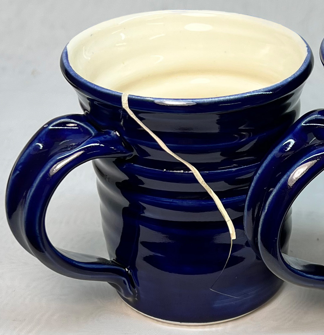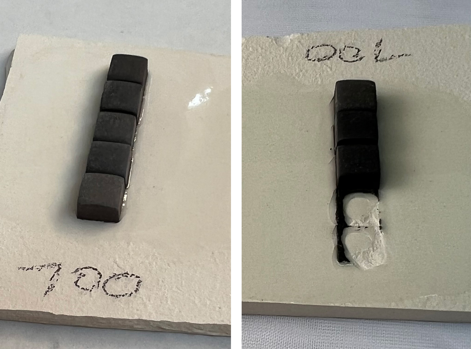 The body has high porosity, but this has an advantage: It soaks up silicone sealer very well. The slip-cast piece on the left was sealed (you can see the surface sheen) and it is impermeable to water penetration (the glaze is not crazed so water cannot penetrate there either). The piece on the right soaks up water readily (on the lower unglazed portion). Bonding test of Spectrum 700 on L4410P