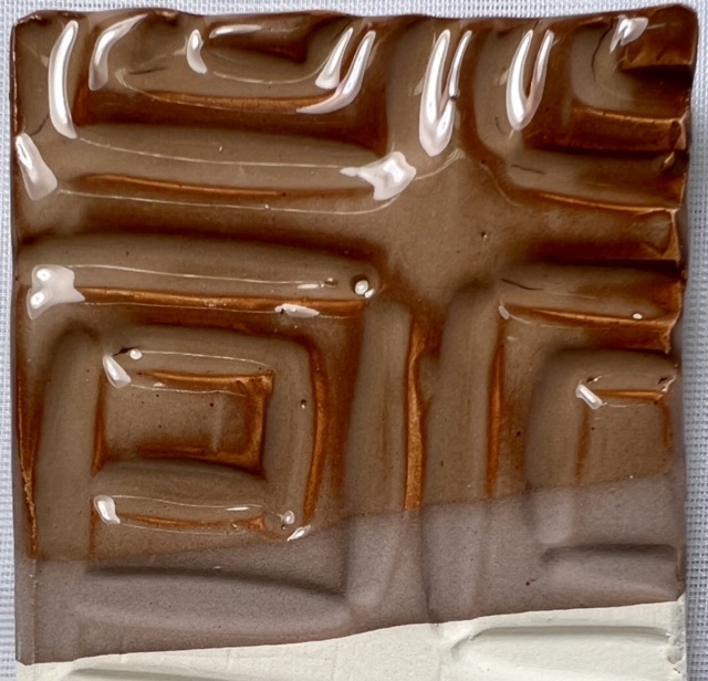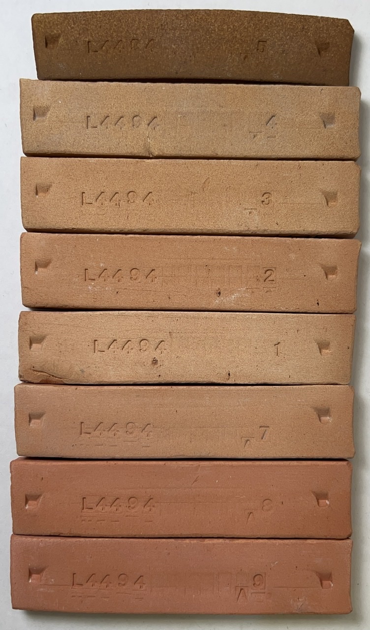 This is L4410P with 4% iron oxide added. Bars are fired from cone 5 (top) down to cone 06 (bottom). G3879C on L4410P dolomite body at cone 04