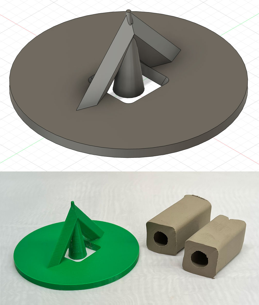 Total:99.50 Notes This has exceptional workability for extruding and rolling, even with this much coarse grog. However pattern cracking has developed compared to the L4543 mix (80:20 kaolin:grog recipe) so this recipe needs further adjustment, especially to reduce the firing shrinkage. Pictures Kiln post extrusion die #3