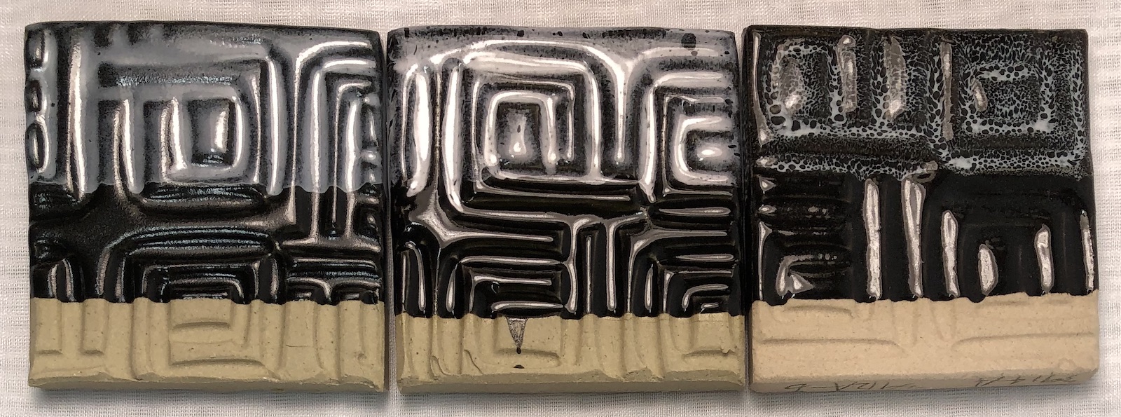G3912A on G2934Y, G2926BL, G3914A blacks at cone 6. Clearly this white is sensitive to the black glaze it is on. It produces the best oil spot effect on G3914A. Black matte mixed July 2021