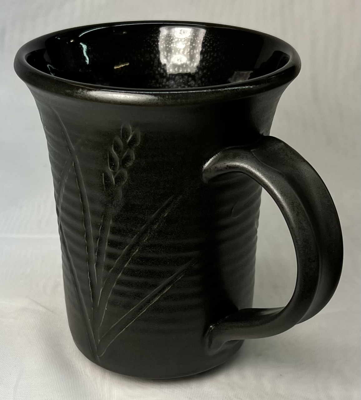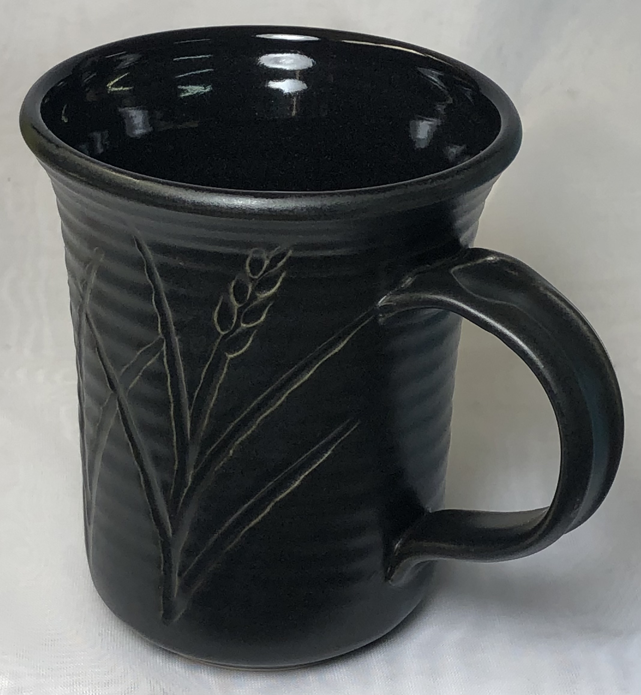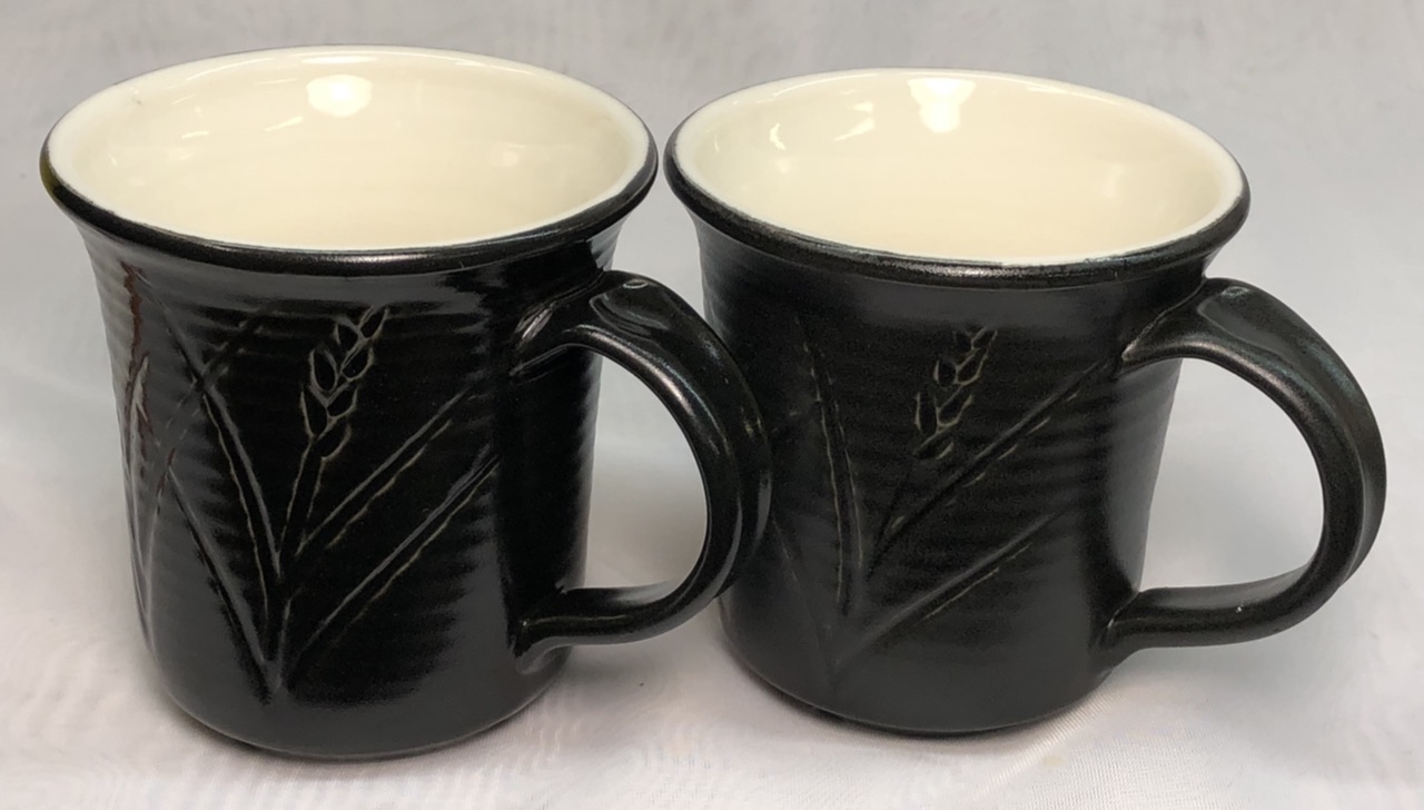 The clay is Plainsman M370. Fired at cone 6 using the PLC6DS drop-and-hold firing schedule. The inside glossy glaze is G2926BL. The outside glaze base is G2934BL matte. Both recipes contain 6% Mason 6600 black stain. G2934BL is tricky to keep consistent because the matte surface is a product of both the chemistry and the firing schedule. Thus we faced lots of testing when it became necessary to substitute Ferro Frit 3124 for the supposed equivalent, Fusion Frit F-19. Early results showed a little better melting, so the 10-15% glossy we normally add to move the stoney matte toward satin is not needed. However, we still made an 85:15 batch for our more frequent slow-cool C6DHSC firings (otherwise this G2934 mug would have fired too matte). So with the two recipes and two schedules I can produce four surfaces, from gloss satin to stony matte. Which black base layer produces the best oil-spot effect?
