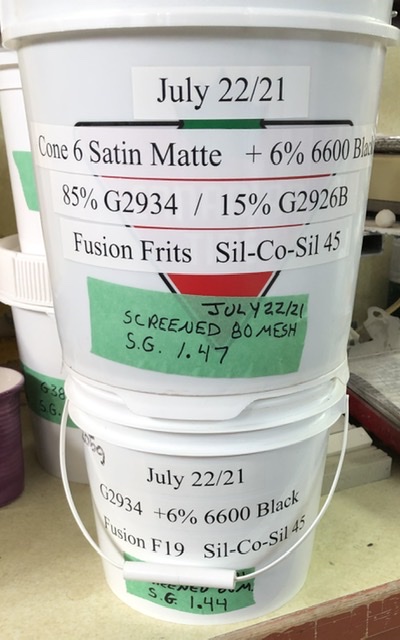 Starting in June 2021 we are switching to Fusion Frits. This batch was made using Fusion Frit F-19 and 45 micron silica. The upper pail is 85:15 Matte/Glossy mix, the lower one G2934 only. G2934 black vs. G2934:G2926B blend black