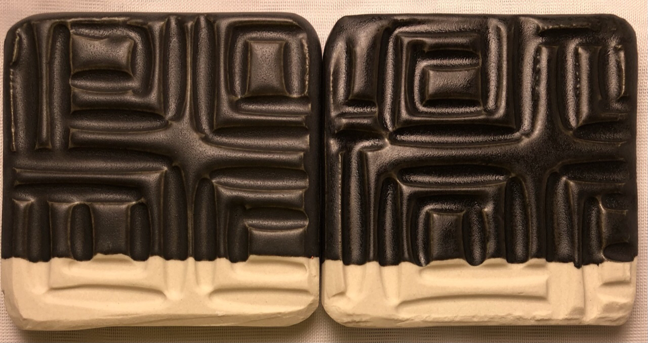 Left is G2934 with 6% Mason 6600. Too matte for most people. Right is 85:15 G2934:G2926B with 6% stain. In this C6DHSC firing is has the degree of matteness that we like. G2934Y and G2934 Black - Fast cool