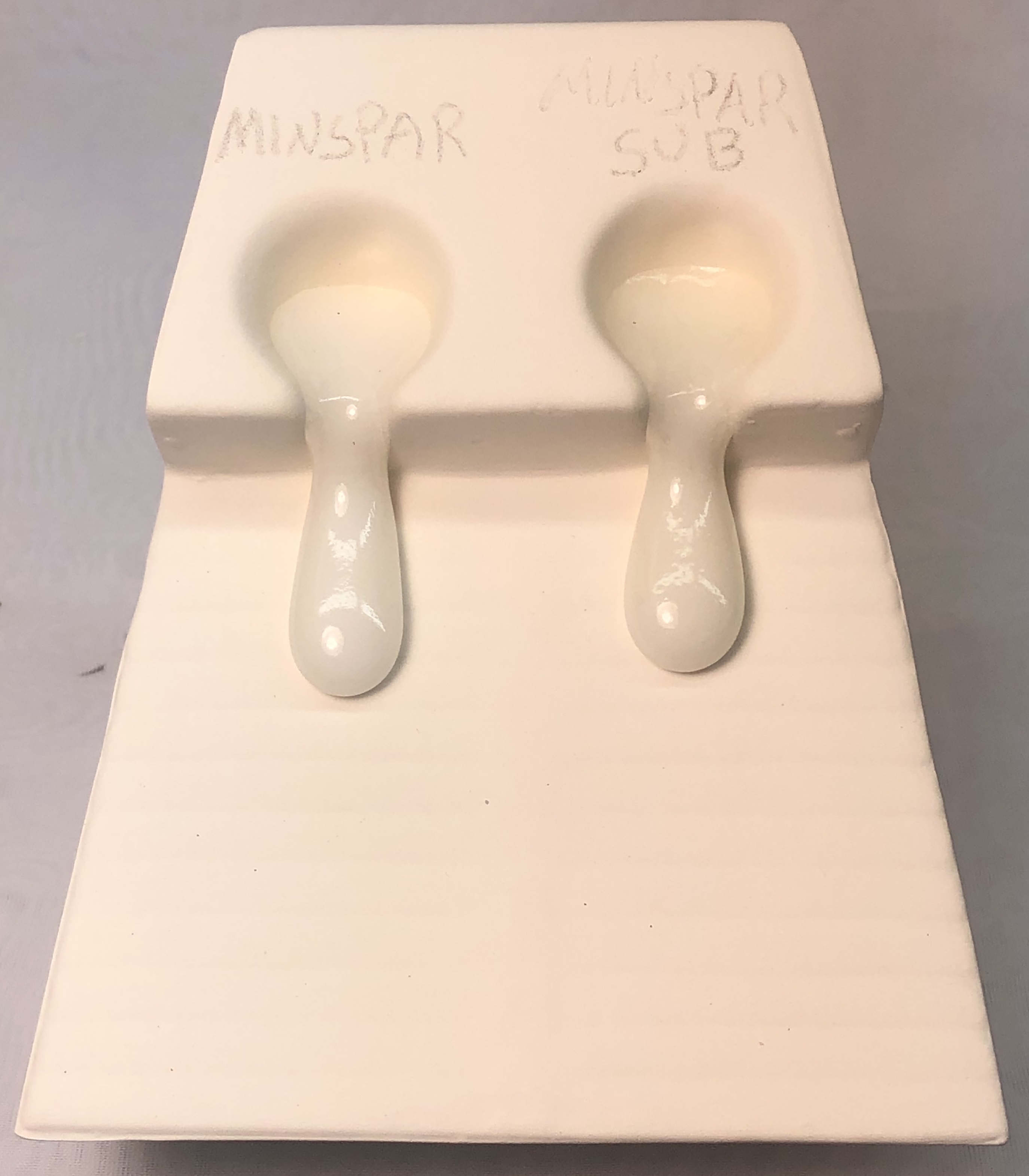 Notes These materials were used to supply the oxides needed to produce the same chemistry as Minspar 200. The trickiest part of the calculation was realizing that I needed a highly concentrated source of Na2O that was also low in Al2O3 - that is the reason for the small amount of frit. Pictures Minspar vs. L4441B synthetic substitute