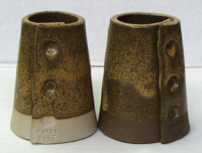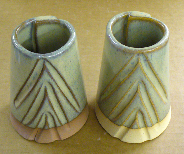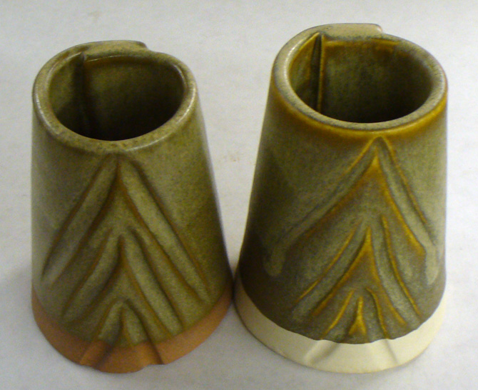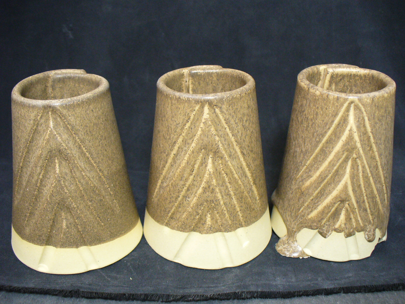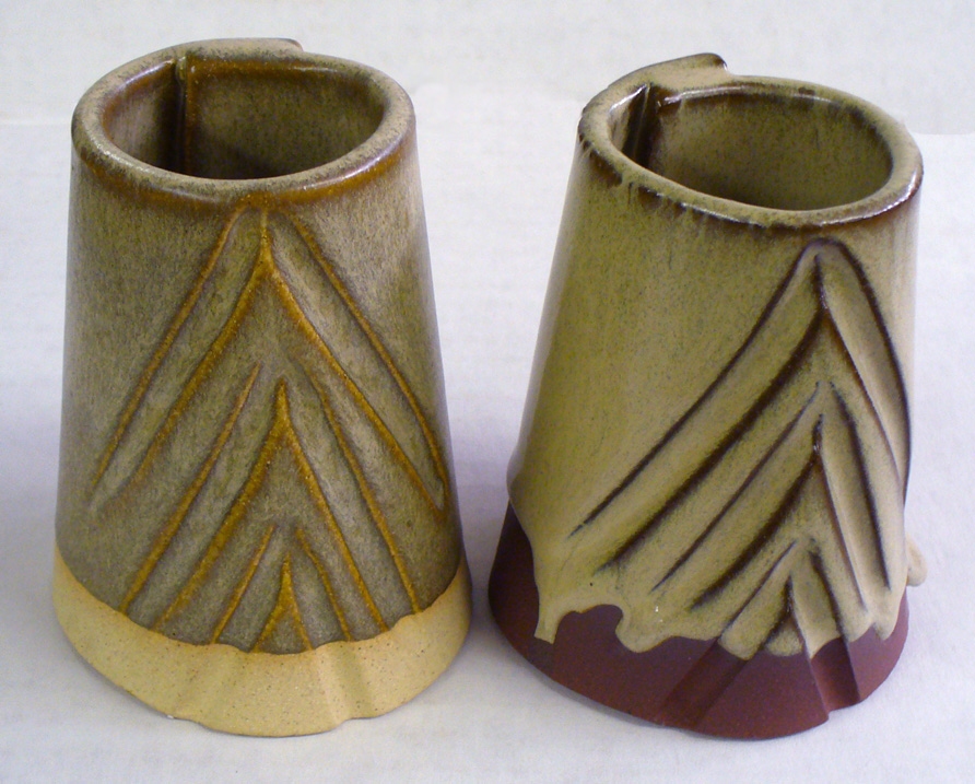 The original photo, from the customer, of the glaze shivering on a black-burning body provided the motivation to try it. We were not able to duplicate the shivering, it fits all the bodies we have tried so far. G3933 on Coffee clay, M340, M340GS
