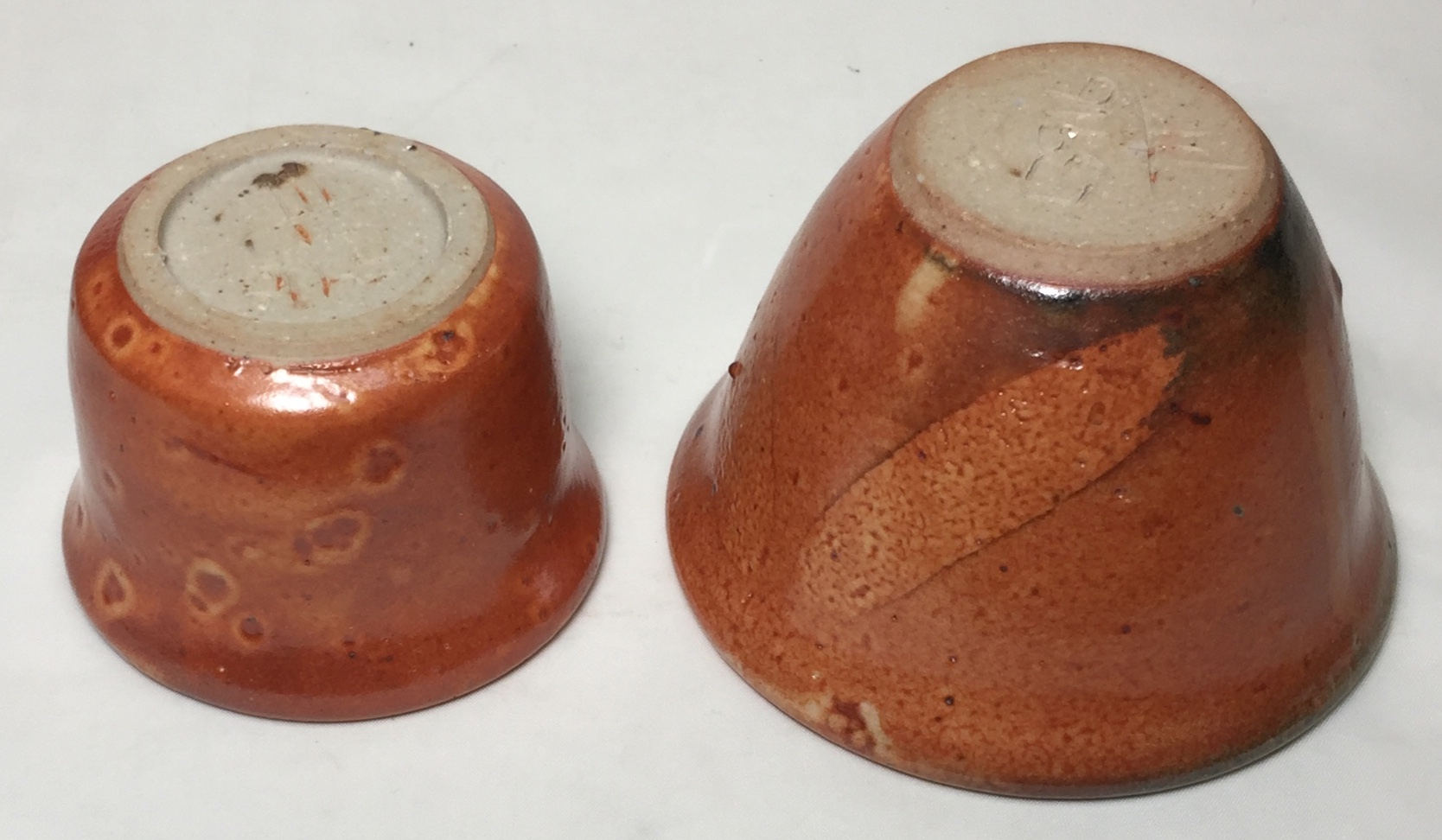 The wax resist brushstrokes (done right after glazing) and clearly defined. This indicates that soda migration to the surface during drying is an important mechanism of the effect. Bizen clay and Shino glaze development