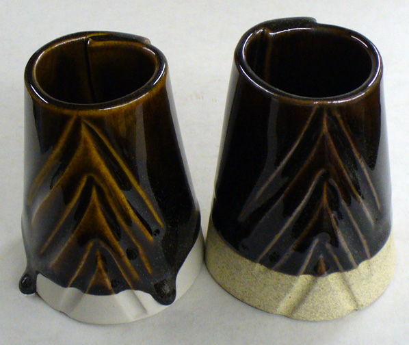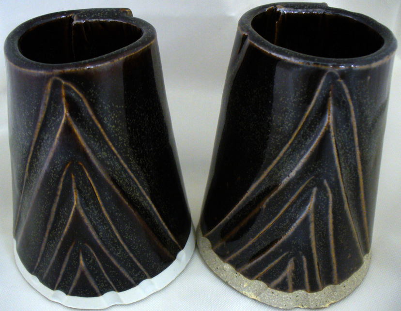 This compares the tenmoku with 1% iron (right) with our standard tenmoku recipe. XML (to paste into Insight) <?xml version="1.0"?> <recipes version="1.0" encoding="UTF-8"> <recipe name="Alberta Slip Tenmoku #1" id="70798" key="h6avyrcx" date="2022-02-26" codenum="G2880" picturebasename=""> <recipelines> <recipeline material="Alberta Slip" amount="100.000" tolerance=""/> <recipeline material="Whiting" amount="5.000" tolerance=""/> <recipeline material="Iron Oxide Red #120" amount="1.000" added="true"/> </recipelines> </recipe> </recipes> Born: 2008-12-03, Modified: 2022-02-26 19:55:22 |