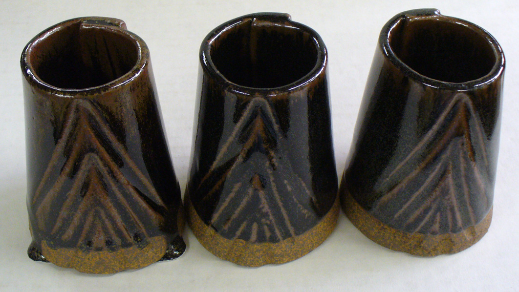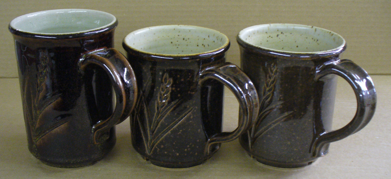 G2894A on left, G2880A center, GA10-A pure Alberta Slip right. G2894A Ravenscrag Tenmoku fired mugs