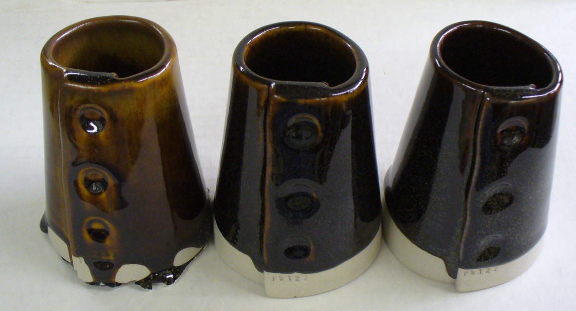 G2894A on left, G2880A center, GA10-A pure Alberta Slip right. G2880A Tenmoku over L3954N black engobe