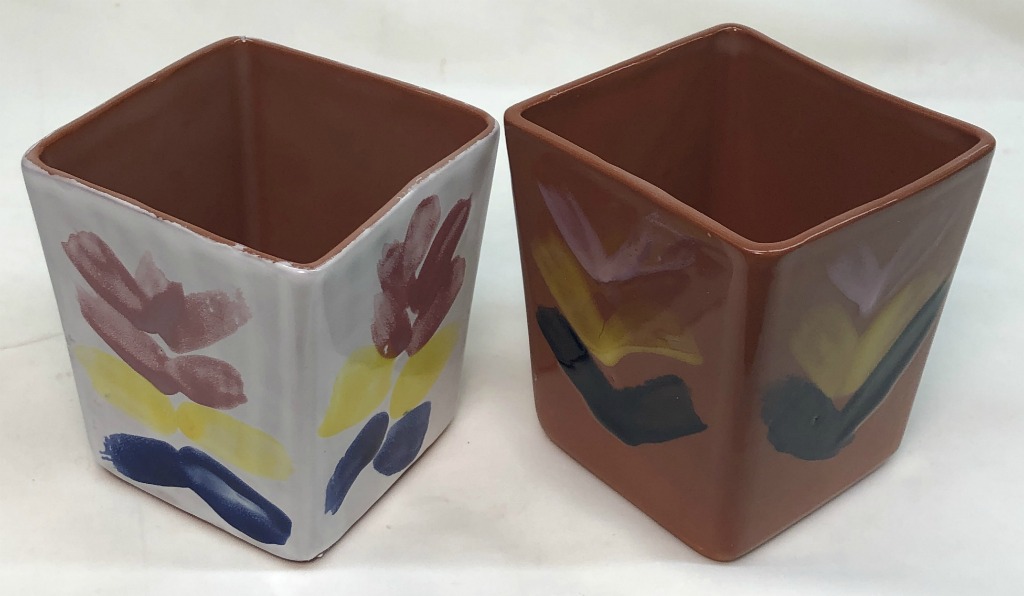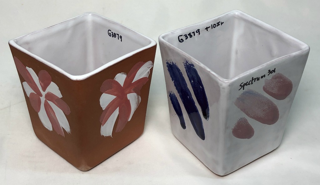 The clear glaze is G3879. The white on the outside of the one on the left has 10% added zircopax. The overglaze colors are Spectrum Majolica colors. L4170 TerraCotta with G3879 zircon white
