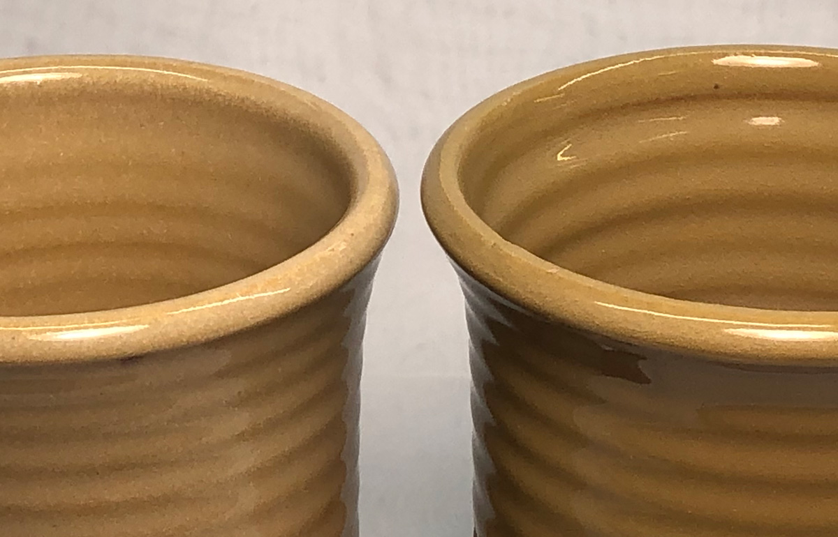 The insides of both are done with a 10% zircopax-added version of G3879. I compared it with Spectrum Majolica white (on the outside of the one on the right, it had to be painted on), the potential to get a much more even coverage is there because we can dip-glaze this one. L4170 at cone 06, 02, 1 (bottom to top)