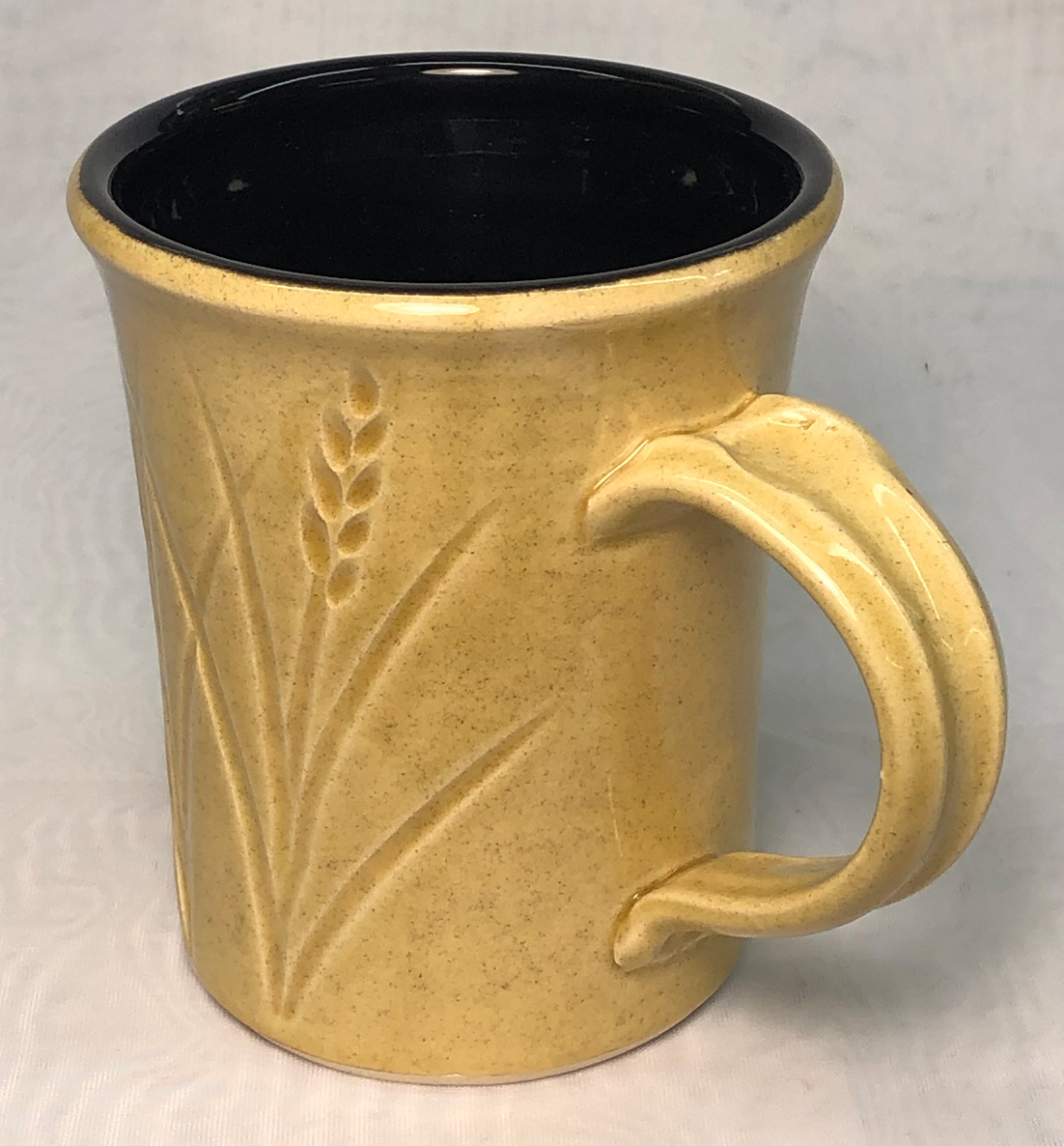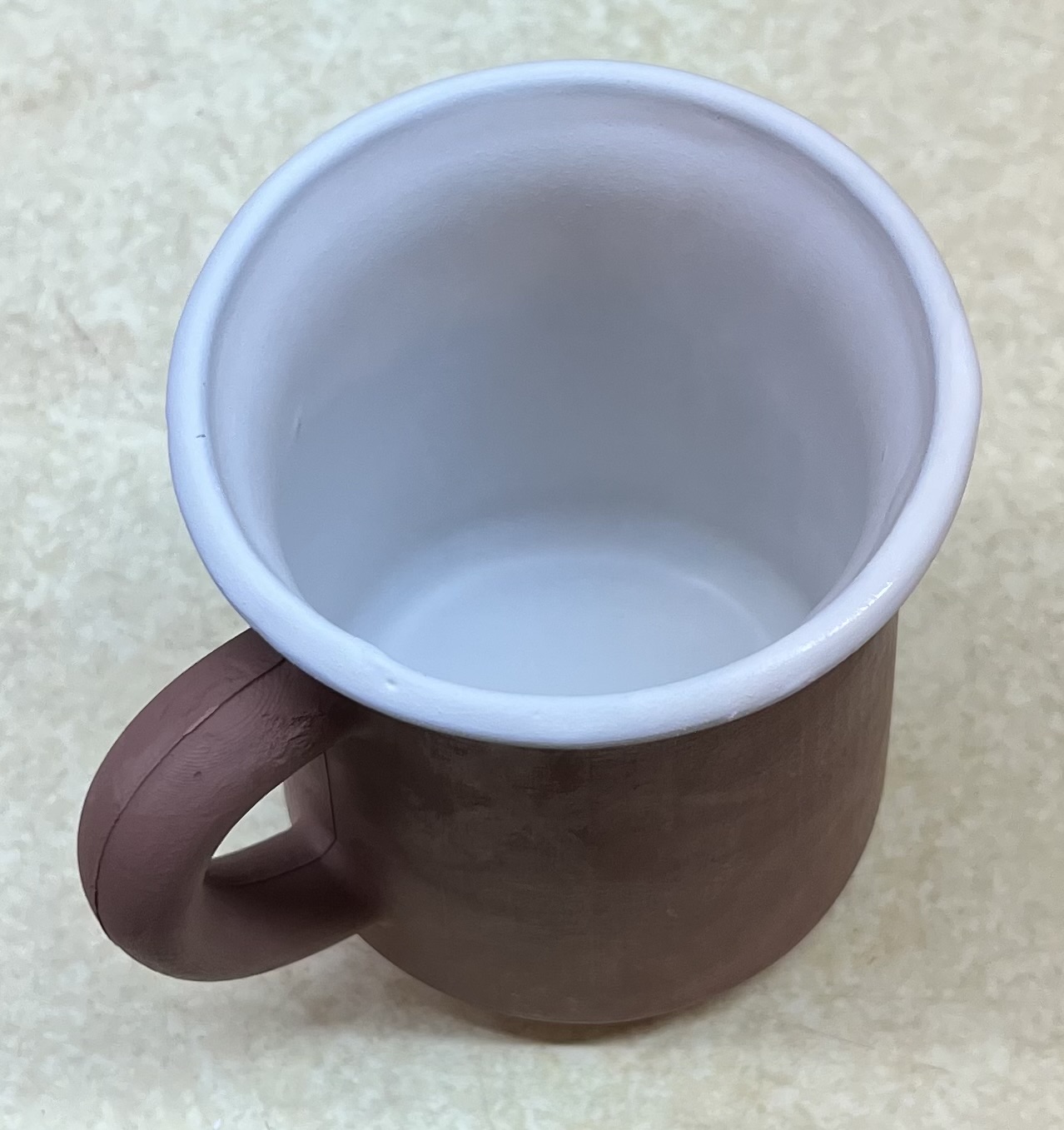 The L3685Z5 thixotropic engobe was applied at leather hard stage (by pour-in, pour-out and then rim dip). Coverage is very even - this will produce a porcelain color under a clear glaze. I plan on outside glazing using a lead bisilicate transparent. Freshly cast mug