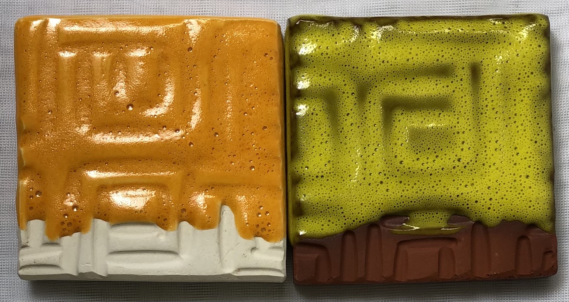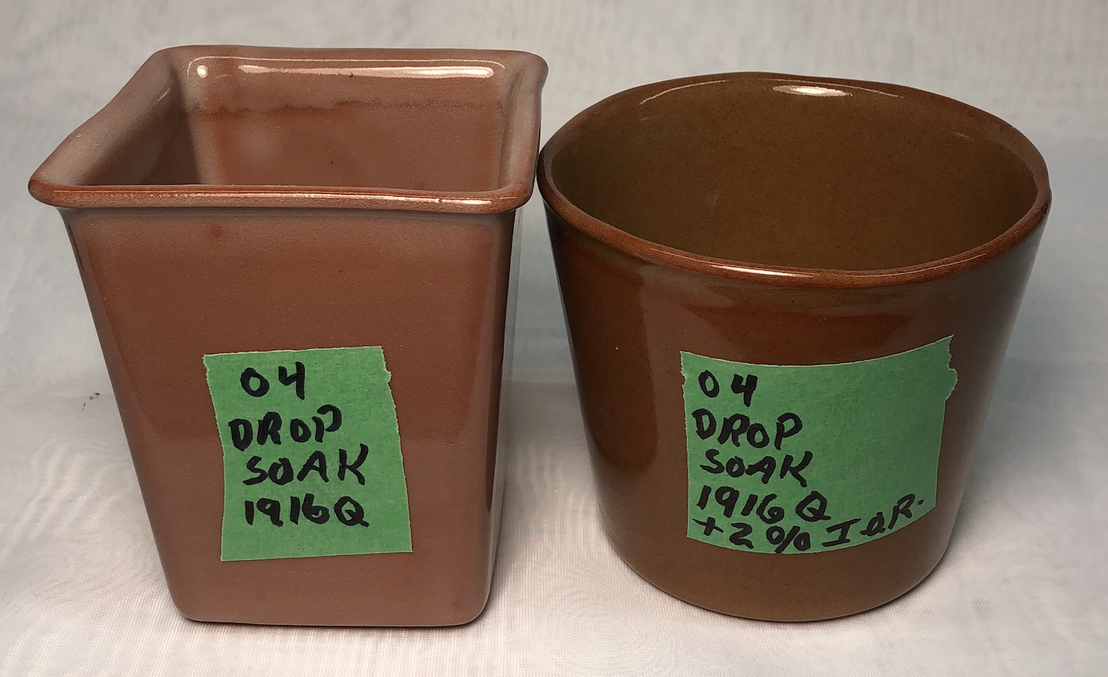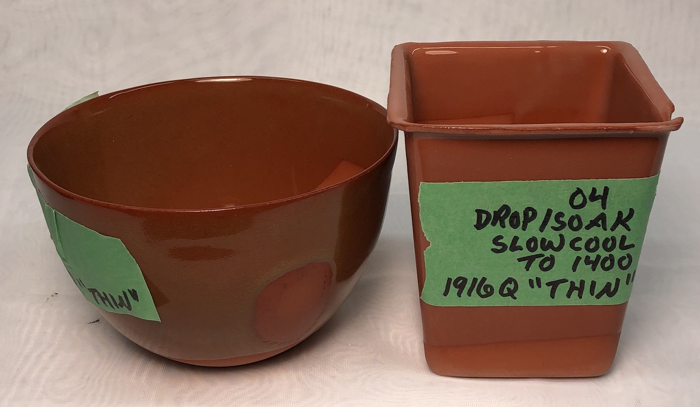 Both were slow cooled. While the cone 04 version is glassy and ultra-gloss, it has significant clouding of micro-bubbles. The cone 03 version, right, is completely transparent. G1916Q on L210 fired at cone 04
