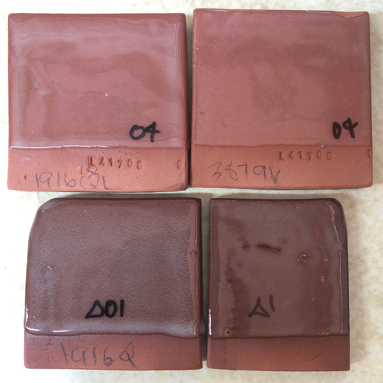 All exited from the klin without crazing. The L215, L213, L210 and L212 samples subsequently survived a 300F/Icewater test without crazing, but the Buffstone did not. The L213 would not likely survive a cold-to-hot test without shivering. 1916Q cone 04, 03