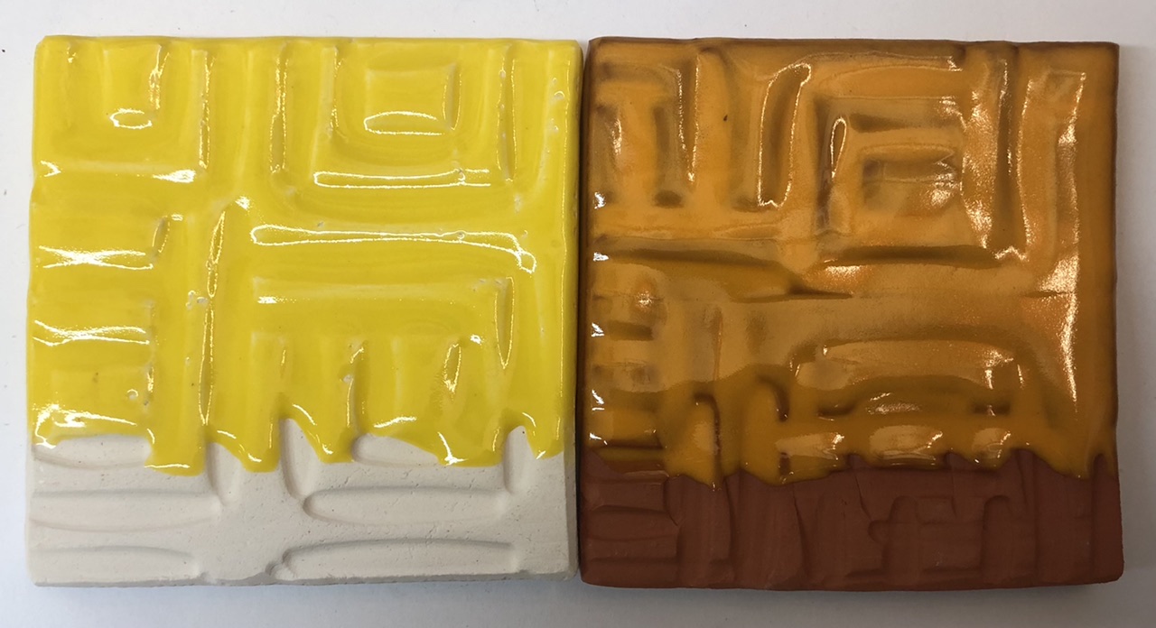 Spectrum low temperature 753 yellow, 754 orange glazes are bubbling at cone 2. Cone 03 with Spectrum 753, 754 glazes