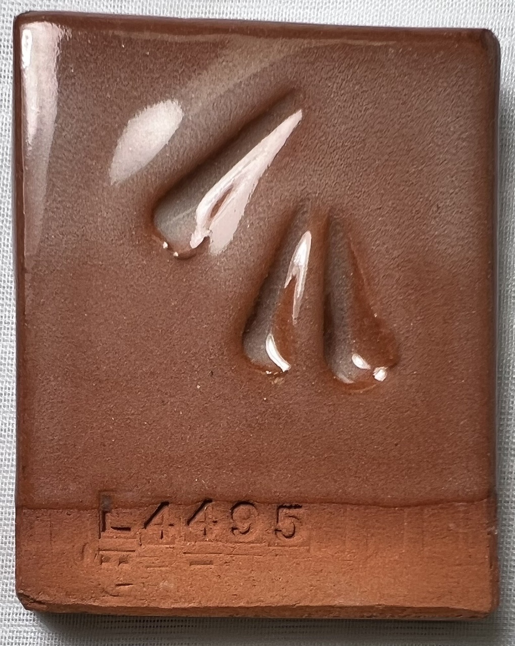 No sign of bloating even at cone 6. But it is clearly melting by cone 8. The front-sides of the cone 5-7 bars have some solubles salts that are glossing edges. G3879 transparent at cone 1 on L4170 terra cotta