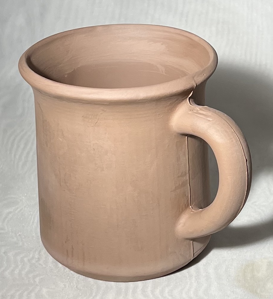 Handles are L215 P6877 pugged clay attached to mugs with the L4170B slip which acts like glue, a minimal amount required to attach handles. No cracking evident anywhere around handles. L4170B Terra cotta fired at cone 3 with G1916Q