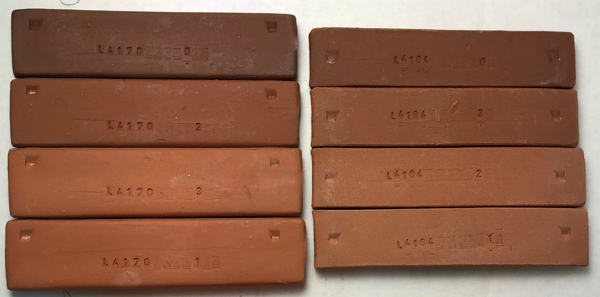 Cone 1 is stoneware strength. Cone 02 is the warmest color. But cone 04 (not shown) is also pretty good. Fired Redart, Tuckers, M2 bars cone 02, 04