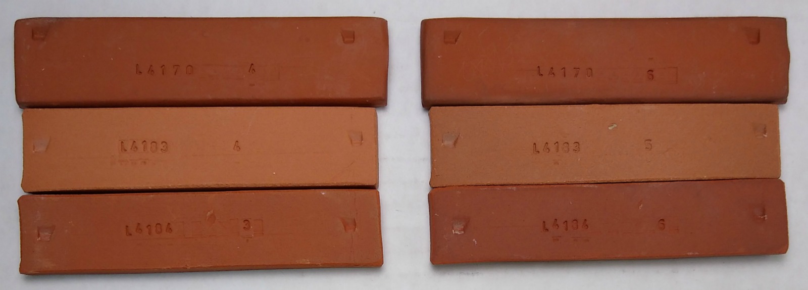 Total:144.96 (R) Notes The original L4170 recvipe was 80:20 Redart:Ball Clay. This change was done to speed up casting time (since ball clay slows it down). However casting rate is still pretty slow. But other qualities are still good. Pictures L4170B bars fired cone 06-8 (bottom to top)