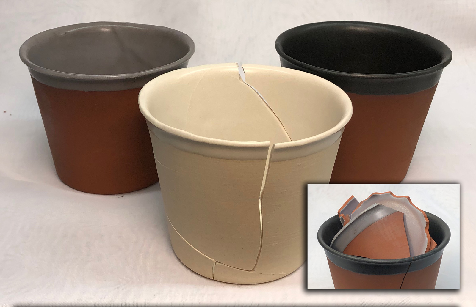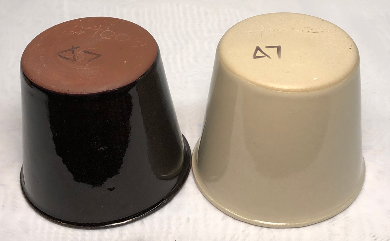 These thinly-cast pieces were glazed only on the inside using G1214Z (front), G2934 (left rear) and G2934Y black. Out-of-the-kiln the buff-burning body (M340 casting) was already broken. After a light tap with a hammer the G2934Y-glazed L4005D piece cracked vertically and the crack split open (because of pressure from the inside). The G2934-glazed piece shattered into about 15 pieces with a hammer tap. This means these glazes are clearly under compression, not in any danger of crazing. So ware needs to be much thicker to withstand the compressive forces. Or the glazes need to incorporate a little sodium to increase their thermal expansion. L4005 Cone 6 casting body