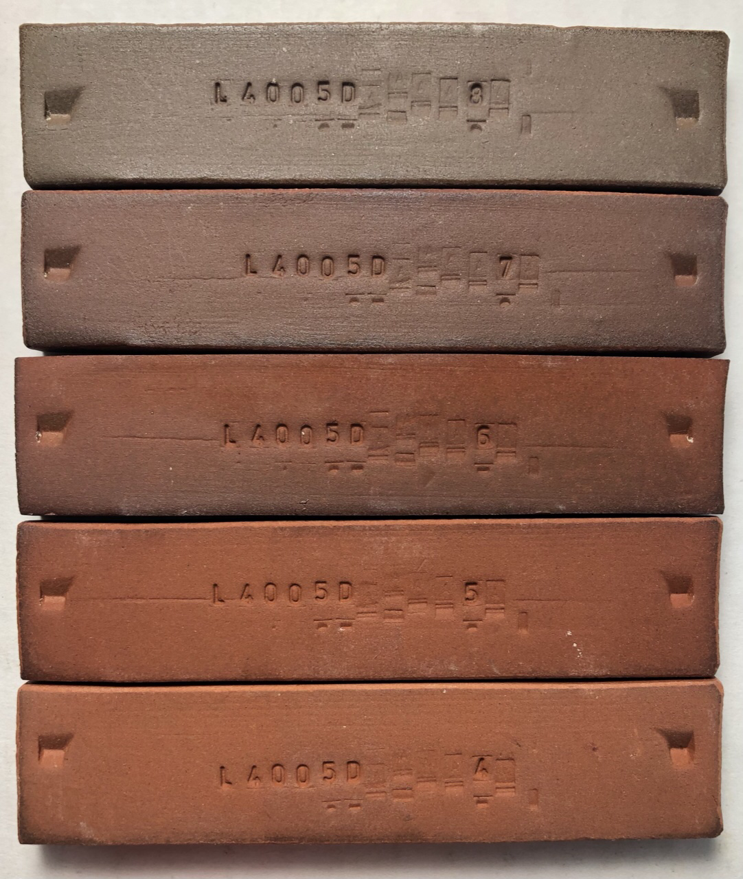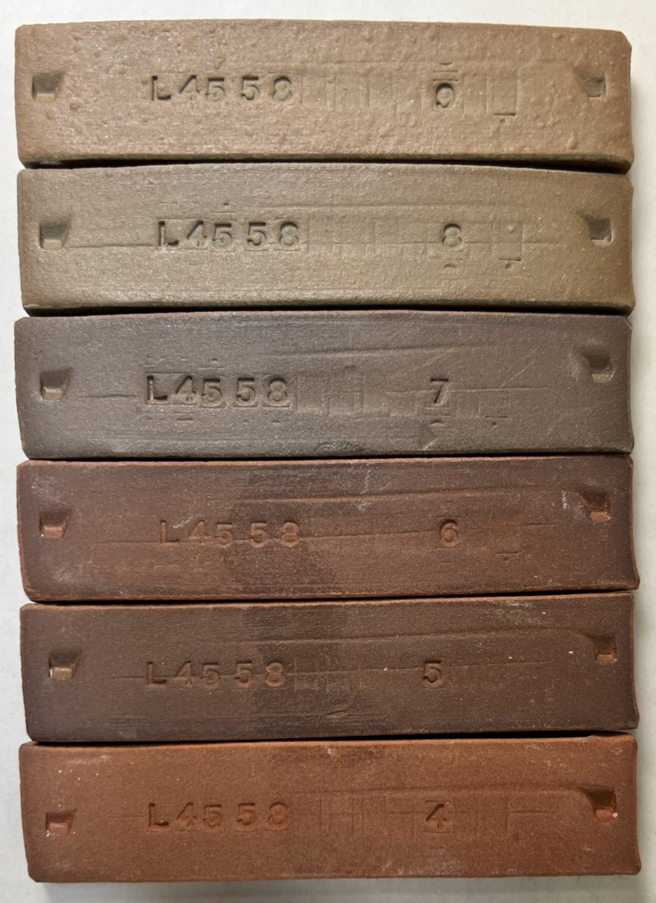 Fired to cone 9, 8, 7, 6, 5, 4 (top to bottom). The clay does have some solubles salts the mute the red a little, the back sides of the bars show the true color better. L4558 fired bars (back sides)