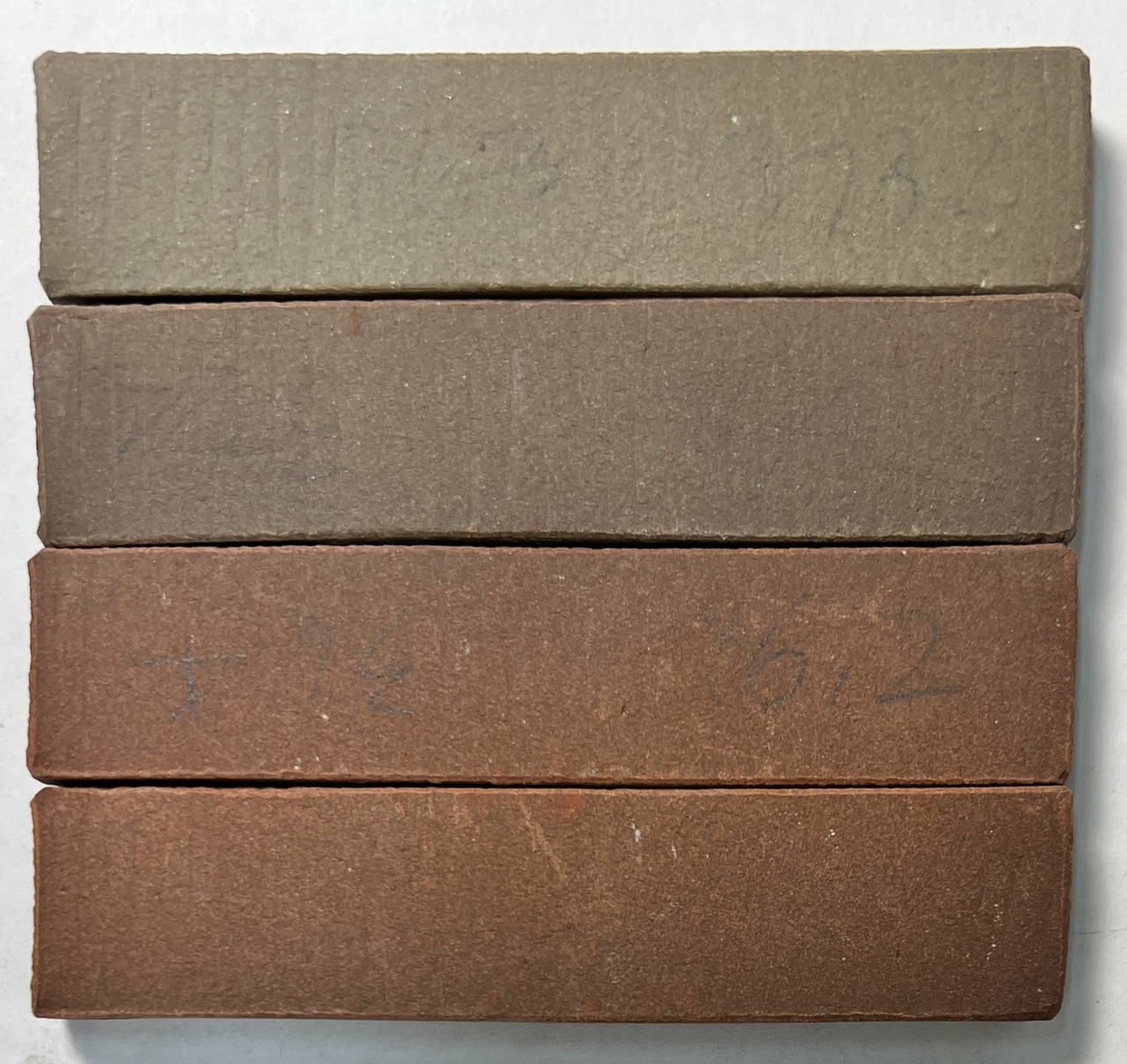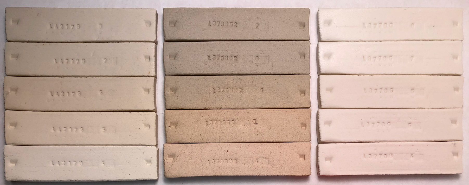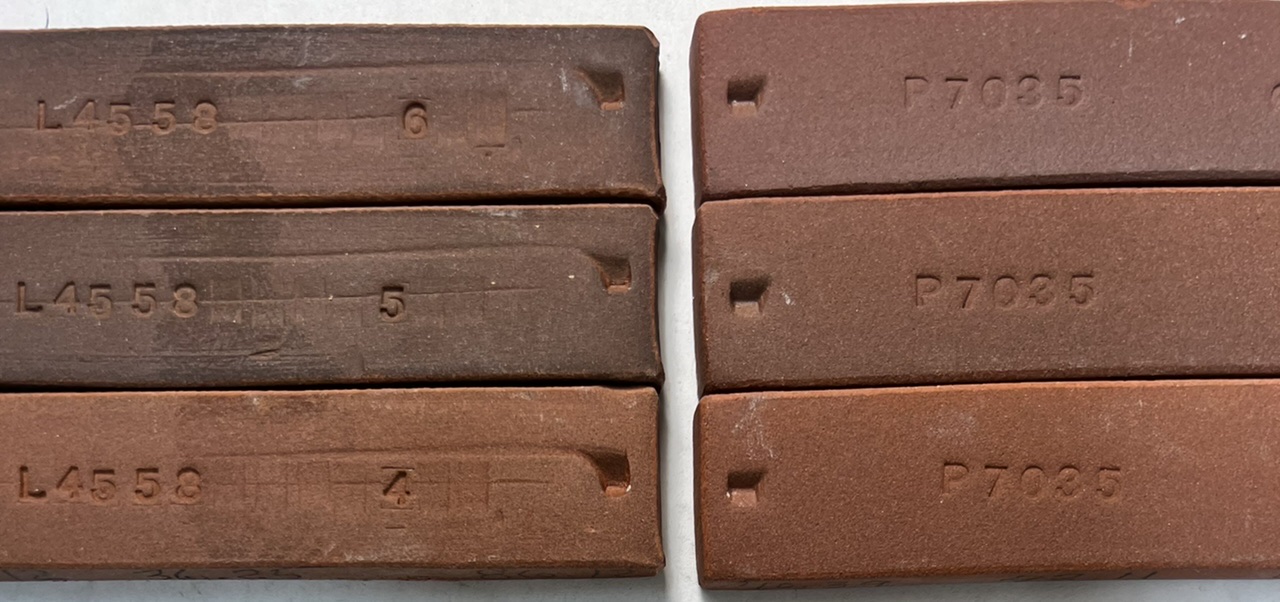 Fired to cone 8, 7, 6, 5 (top to bottom). L4558 fired bars compared to Plainsman M390
