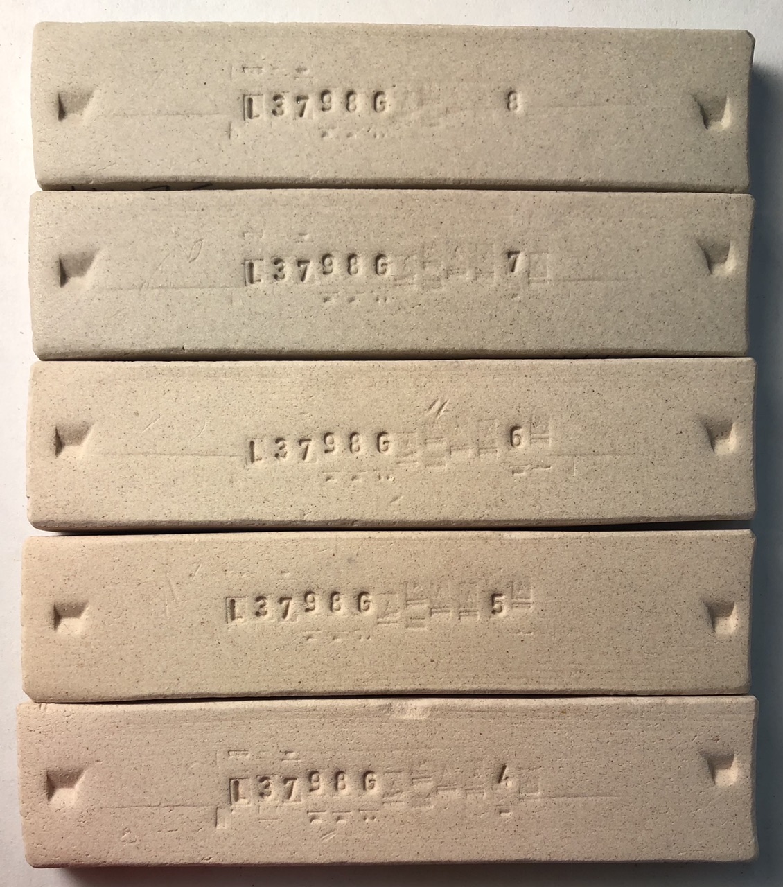 Fired from cone 8 to 4 (top to bottom). L3798G M340 Casting Body Revision 7 fired bars