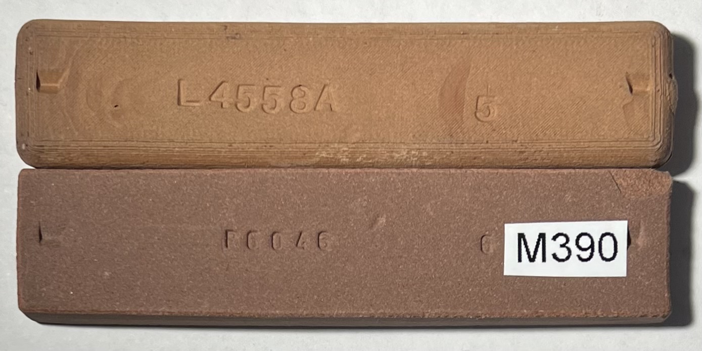L4558A is not mature enough on the bottom of this slip castbottle. That being said it has plenty of firing shrinkage, so this is being heatsink by the kiln shelf. L4558A M390 vs M390