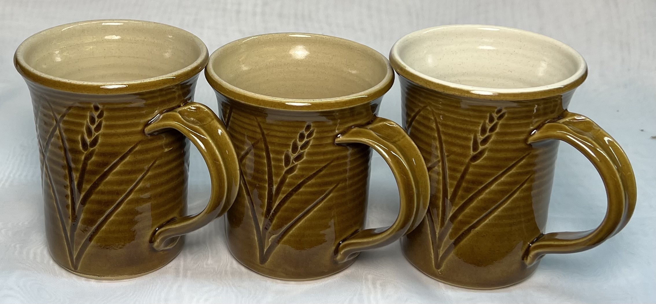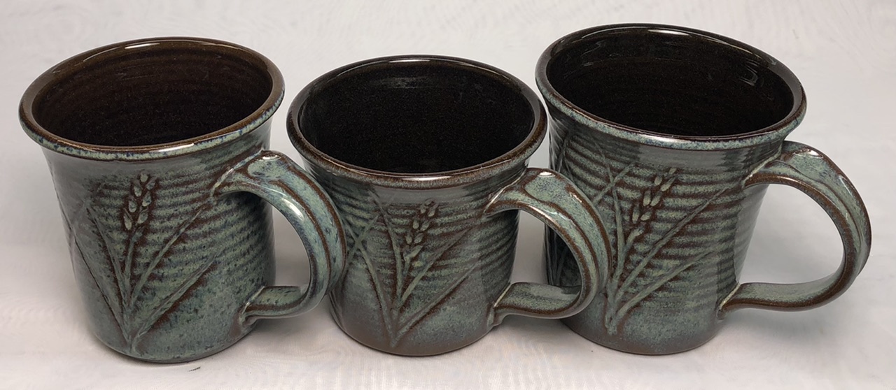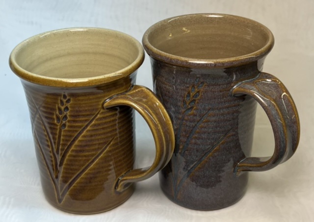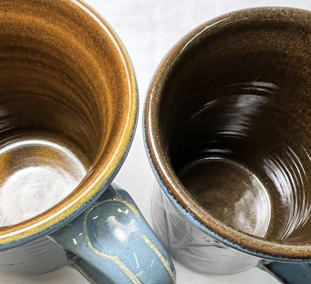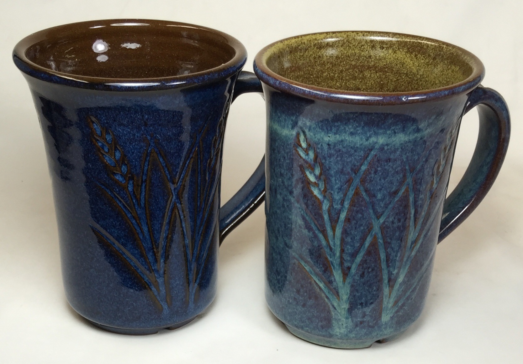 The body is buff-burning Plainsman M340 (cone 6). The amber-colored glaze is 80% Alberta Slip (raw:calcine mix) with 20% of each frit. The inside of mug 1 is white engobed (L3954A) and with transparent over it (G2926B). GA6-B Alberta Slip base glaze does not crystallize