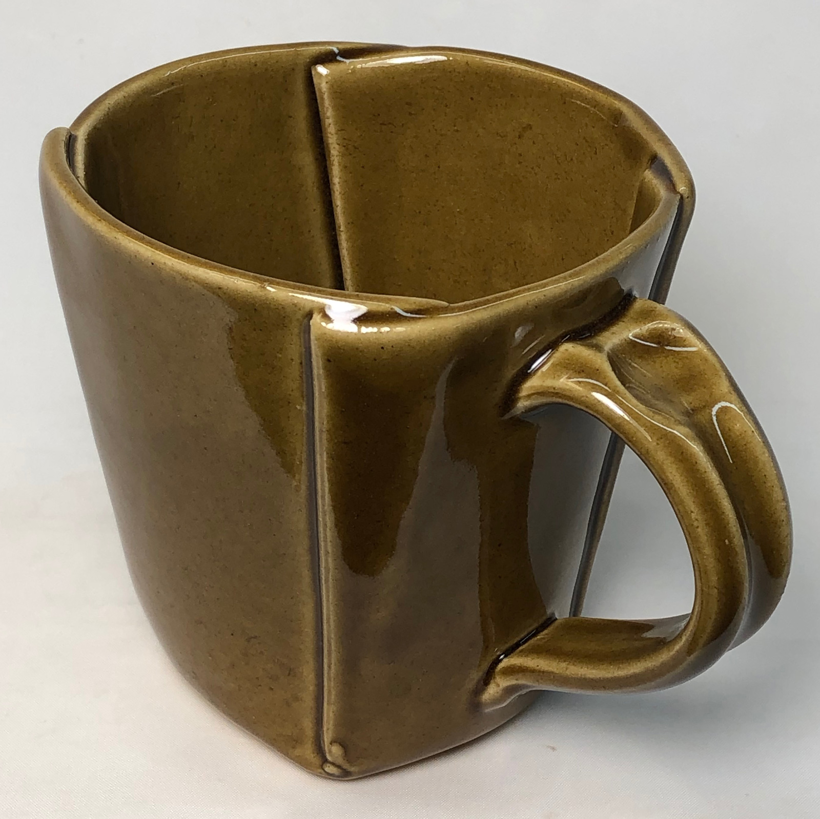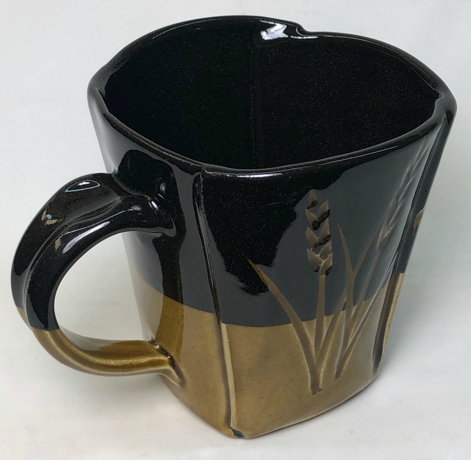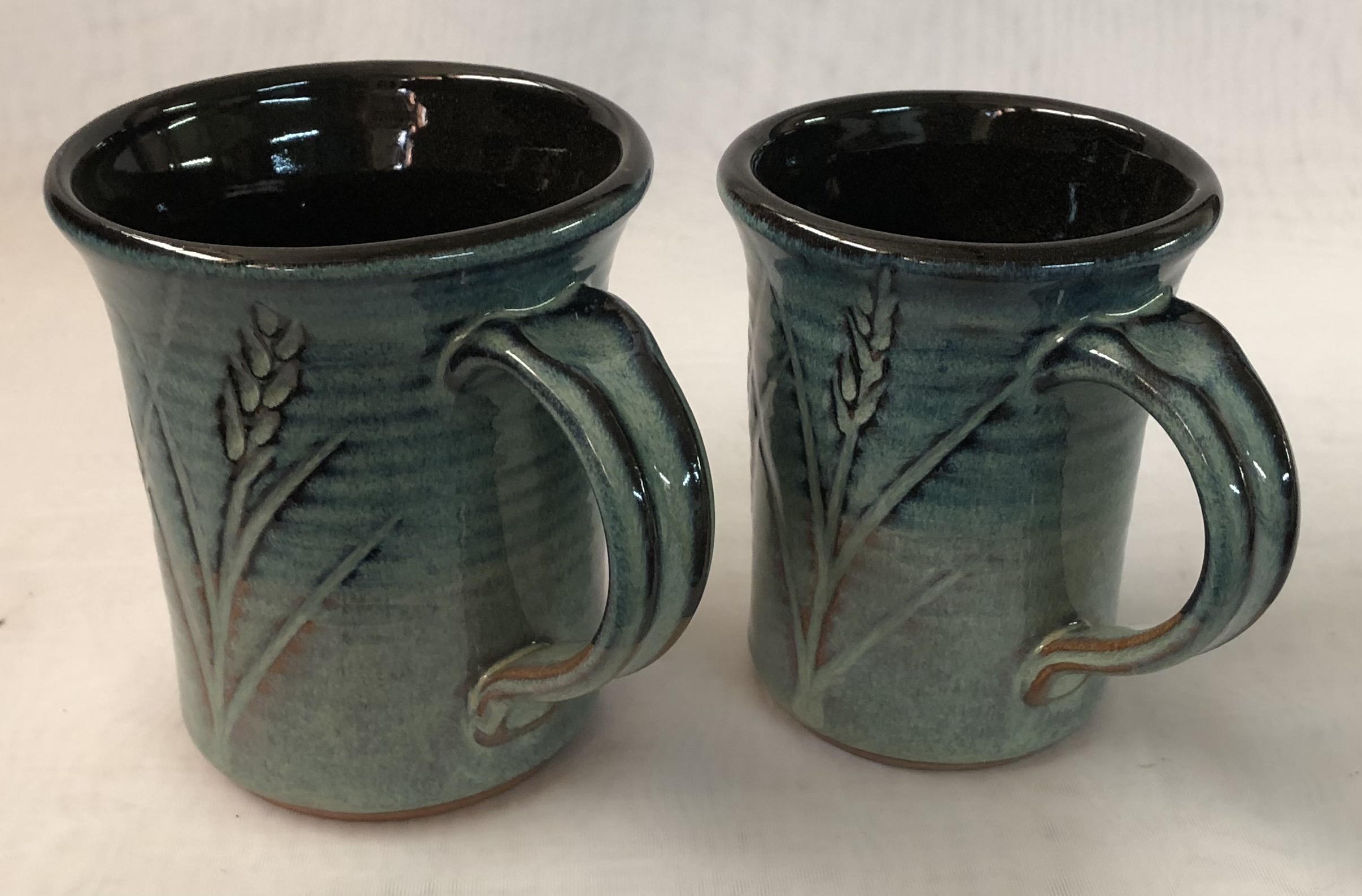 The body is buff-burning Plainsman M340 (cone 6). The amber-colored glaze is 80% Alberta Slip (raw:calcine mix) with 20% of each frit. The inside of mug 1 is white engobed (L3954A) and with transparent over it (G2926B). GA6-B Alberta Slip base glaze does not crystallize
