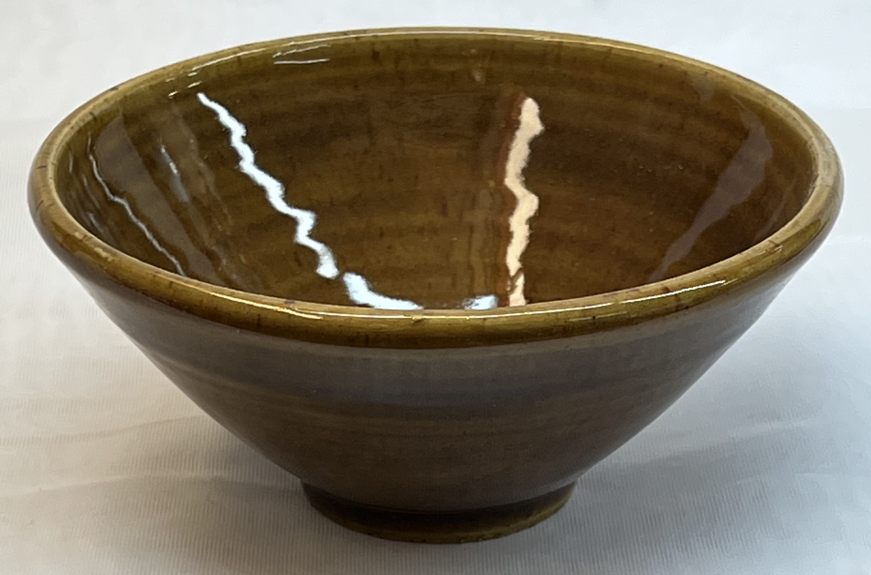 This is among the glossiest surfaces we have seen. This inside surface of this bowl is so slippery that contents will slide out unless proper care is taken! P6954 M325 with G3903 outside at cone 4 DS firing