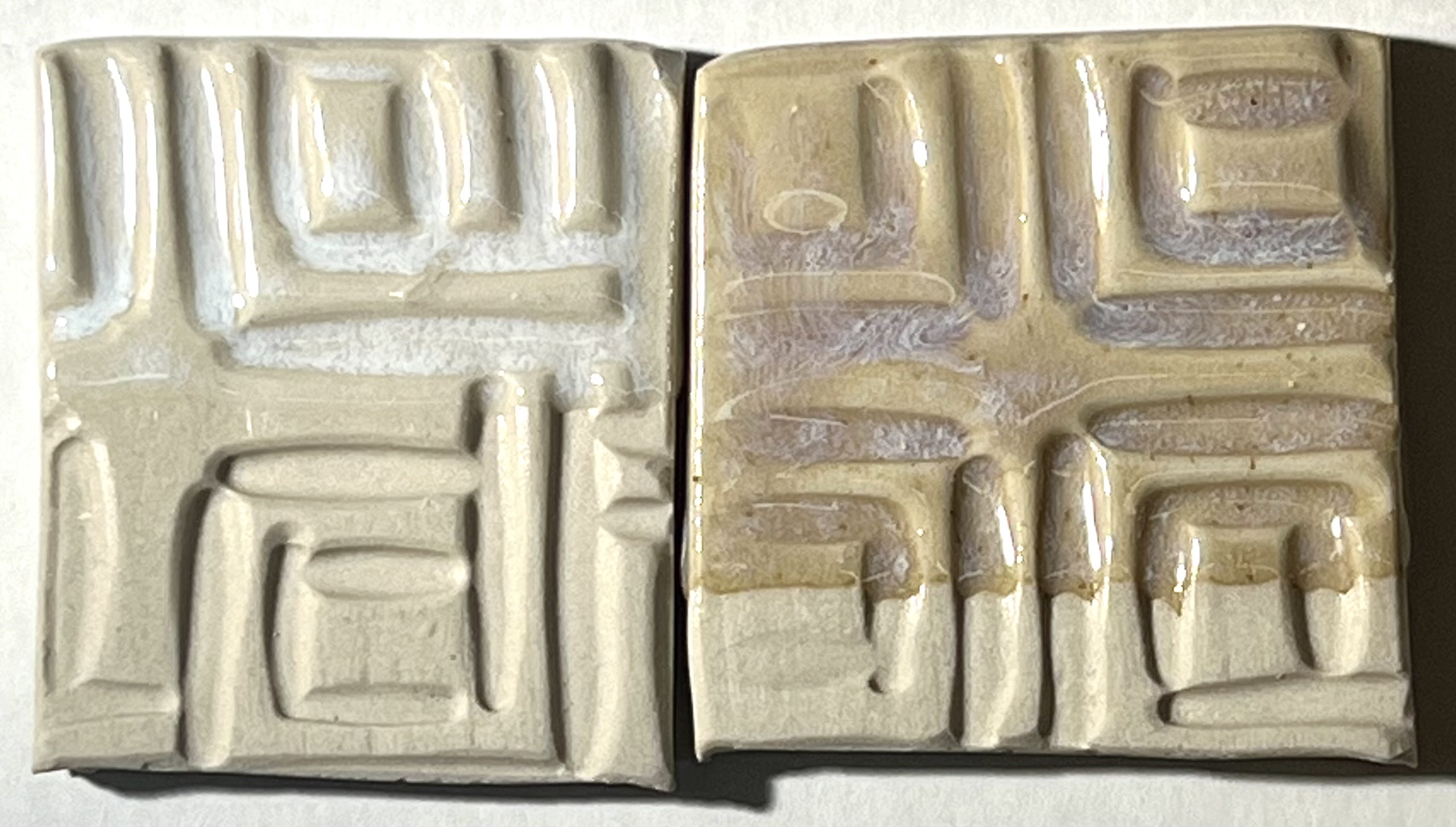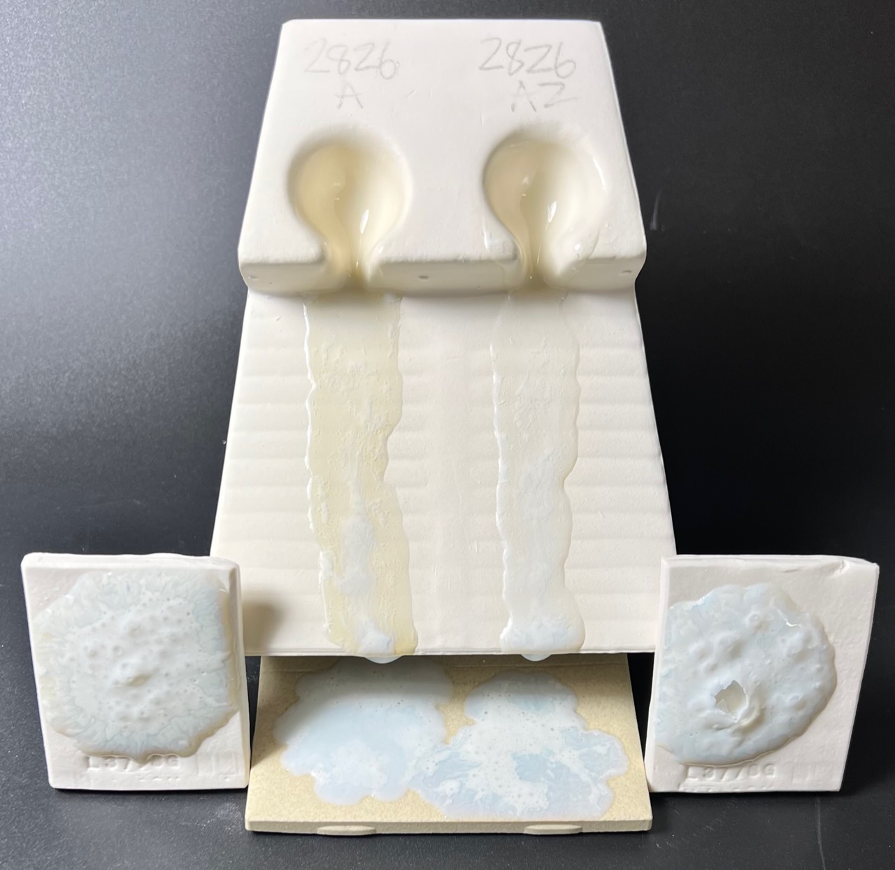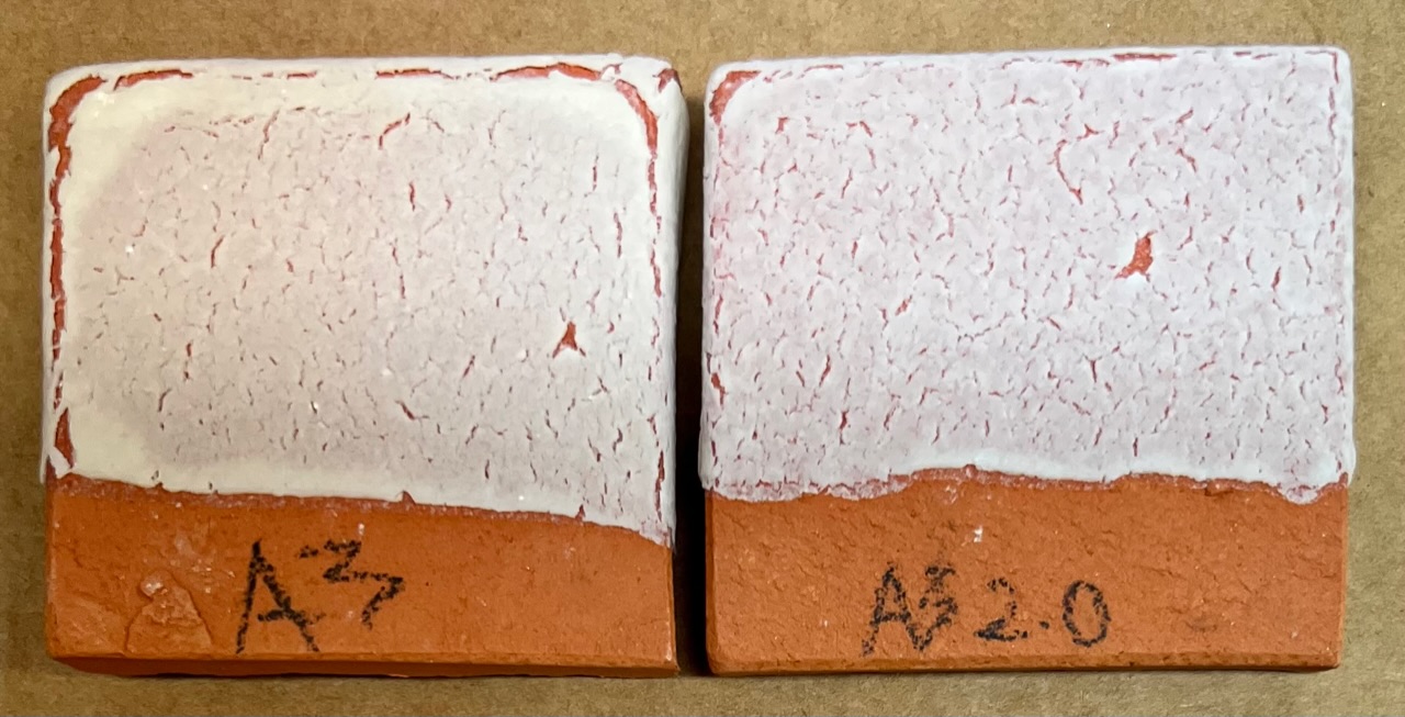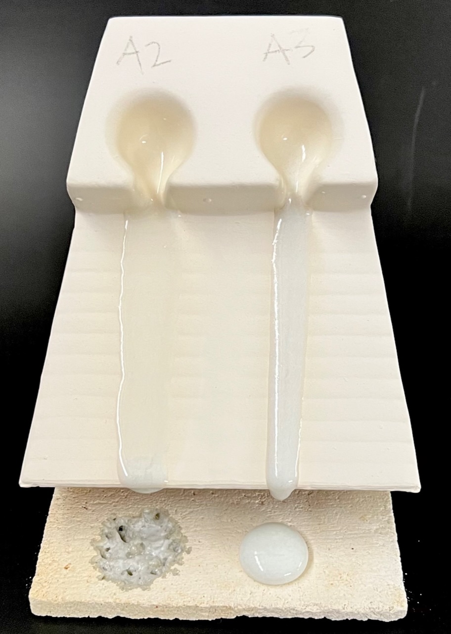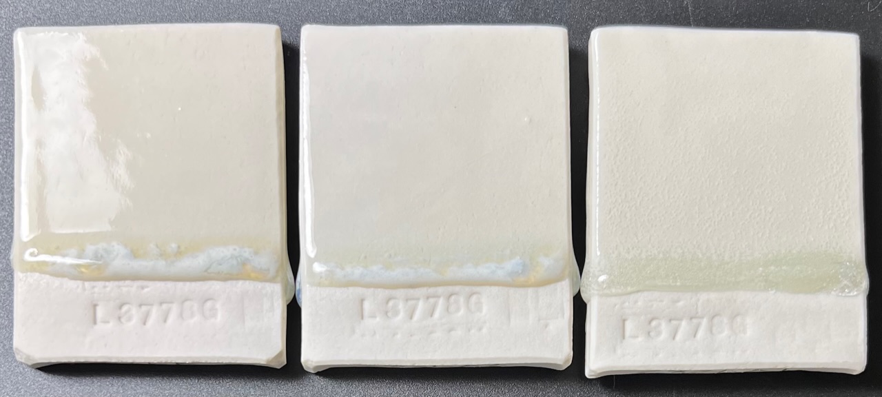 If a better quality functional glaze is needed then the G2826A1 fritted version on the right is much better. That being said, many people seek the visual character of the one on the left. Perhaps a mix of the two could reduce some of the working and technical issues with the G2826A version. G2826A vs G2826A1 low test