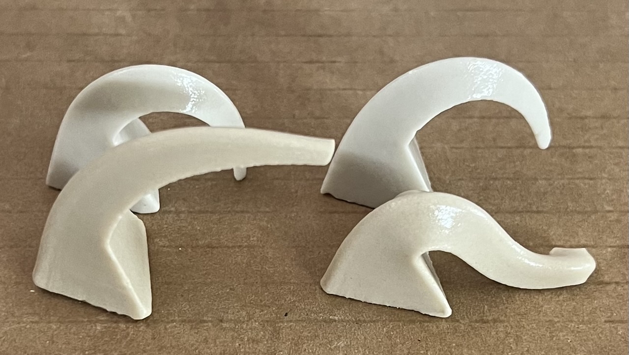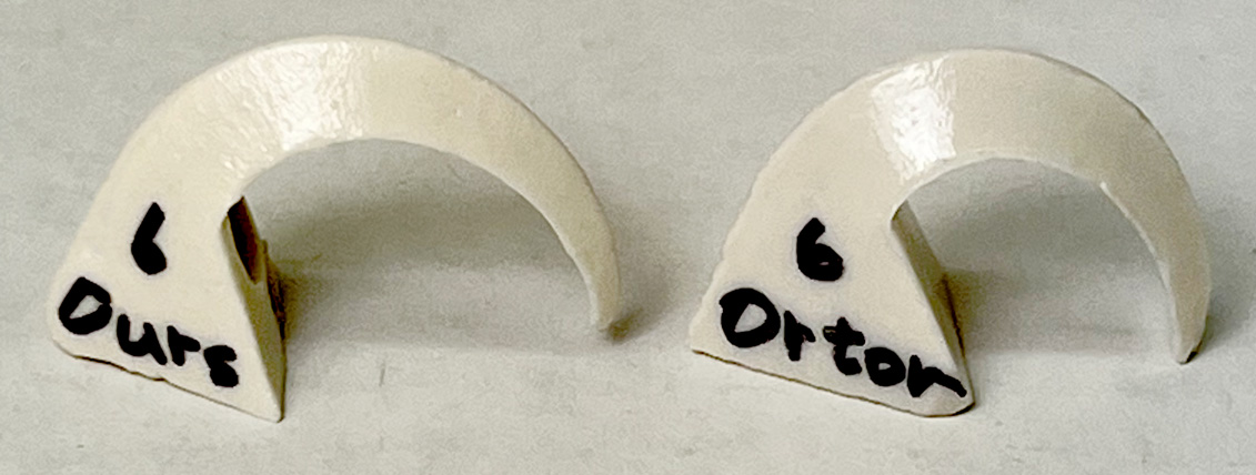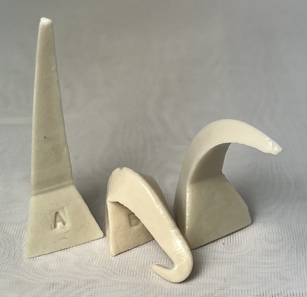 An orton cone on the left, this trial on the right. This is almost bending enough at cone 7. XML (to paste into Insight) <?xml version="1.0"?> <recipes version="1.0" encoding="UTF-8"> <recipe name="Pyrometric cone pressing body #2" id="221646" key="edXBEBSm" date="2022-08-16" codenum="L4532A"> <recipelines> <recipeline material="Nepheline Syenite" amount="25.000" tolerance=""/> <recipeline material="Pioneer Kaolin" amount="40.000" tolerance=""/> <recipeline material="Silica" amount="25.000" tolerance=""/> <recipeline material="Fusion Frit F-75" amount="20.000" tolerance=""/> <recipeline material="Veegum" amount="3.000" tolerance=""/> </recipelines> </recipe> </recipes> Born: 2021-03-08, Modified: 2022-08-16 19:05:34 |