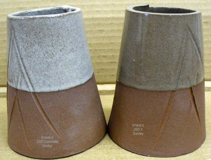 This clay, L4115J3S, a Plainsman 3D-based body, fires vitreous and dense, yet there is no hint of bloating. With these matte glazes very durable and functional pieces are produced. Melt flow comparison: G2934 with Frit 3124, Frit F-19