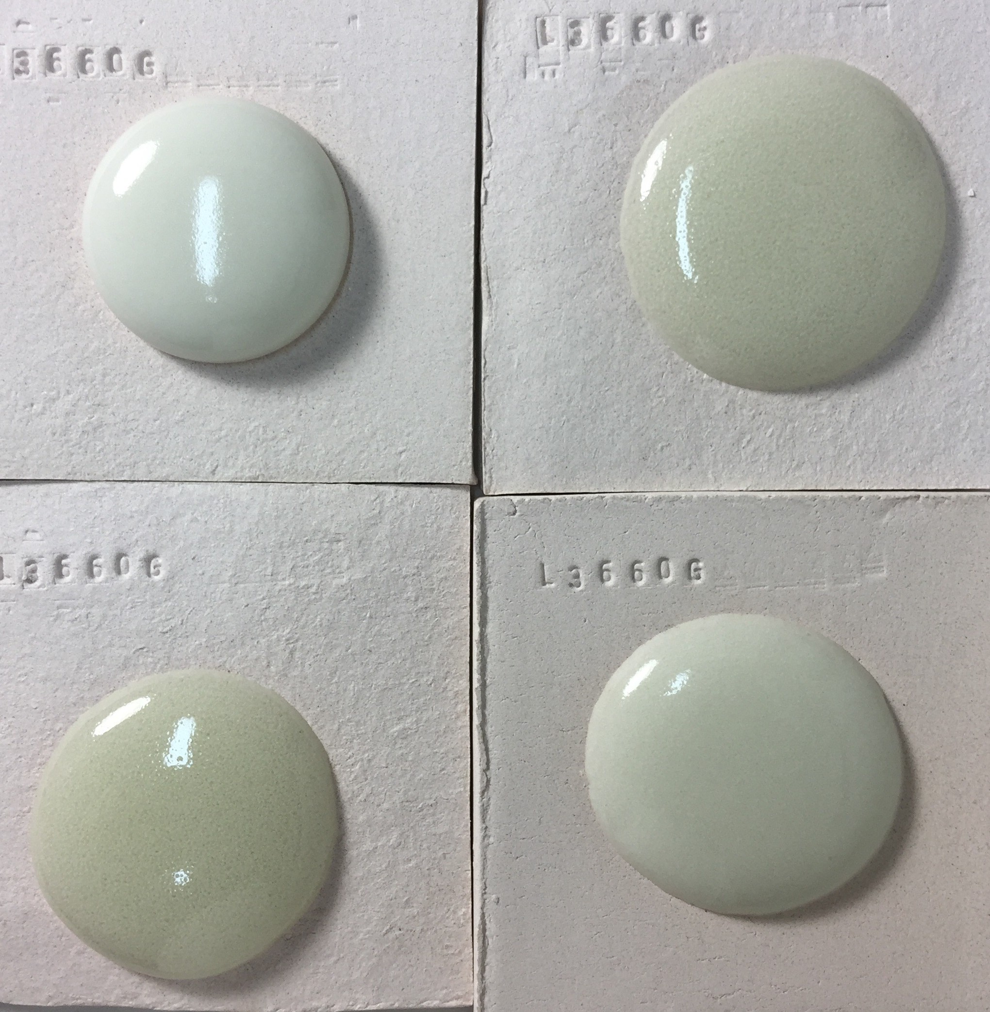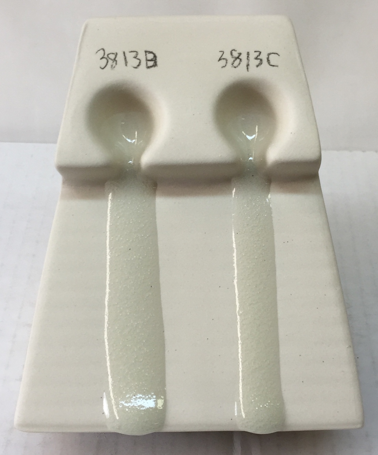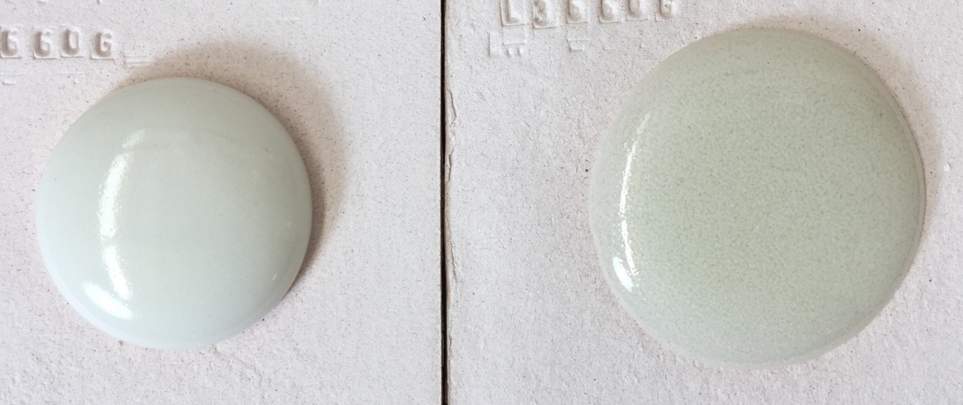 Fires super glossy, looks good. But there are entrained bubbles (top) vs. no bubbles in 2926B one below. 2926B vs G3813B clear glaze melt balls
