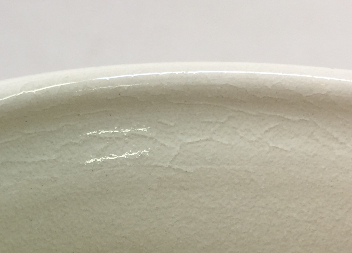 Others also had bubbles, but there are alot here. And they are all the same size (in clouds). Although the photo does not show it clearly, hundreds of these are breaking at the surface, leaving dimples. This was fired by drop-100F-an-soak. This would do better in clearing itself with thinner application. G3814 Low Zinc High Feldspar Fritless base melt balls