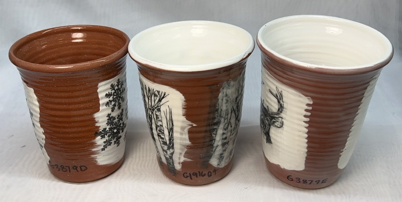 The move from ball clay to New Zealand kaolin (centre mug vs right mug) greatly improves the clarity (because of the reduction in iron and titanium). G3879C vs. G1916QL on L4410K low fire white