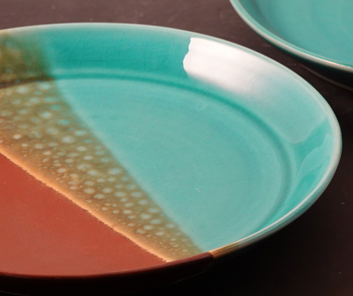 The top base glaze has just enough melt fluidity to produce a brilliant transparent (without colorant additions). However it does not have enough fluidity to pass the bubbles and heal over from the decomposition of this added copper carbonate! Why is the lower glaze passing the bubbles? How can it melt better yet have 65% less boron? How can it not be crazing when the COE calculates to 7.7 (vs. 6.4)? First, it has 40% less Al2O3 and SiO2 (which normally stiffen the melt). Second, it has higher flux content that is more diversified (it adds two new ones: SrO, ZnO). That zinc is a key to why it is melting so well and why it starts melting later (enabling unimpeded gas escape until then). It also benefits from the mixed-oxide-effect, the diversity itself improves the melt. And the crazing? The ZnO obviously pushes the COE down disproportionately to its percentage (although there is further to go because it is crazing somewhat). Copper Blue G8306C using copper carbonate, oxide