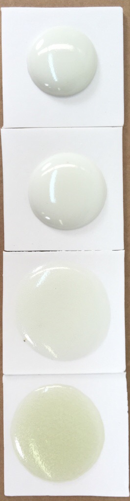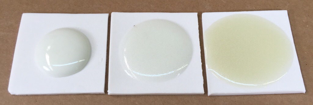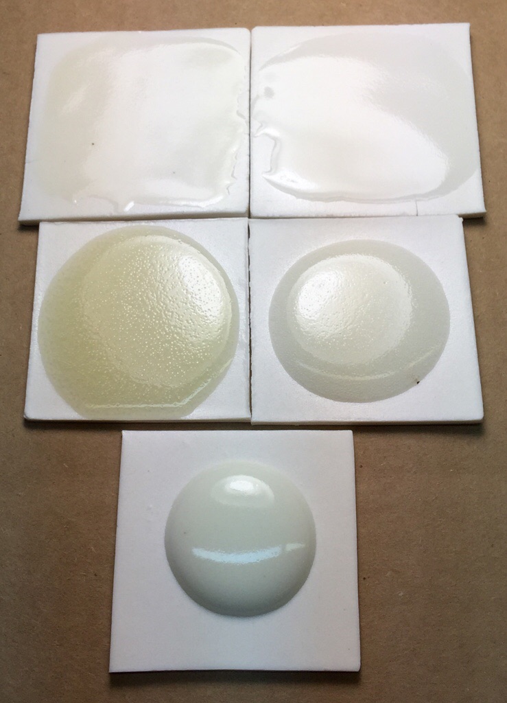 These are 10 gram glaze balls are fired down onto tiles to demonstrate melt fluidity and bubbling. Fluid cone 6 clear glaze comparison