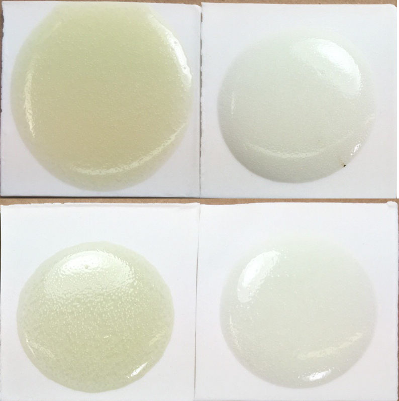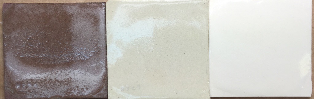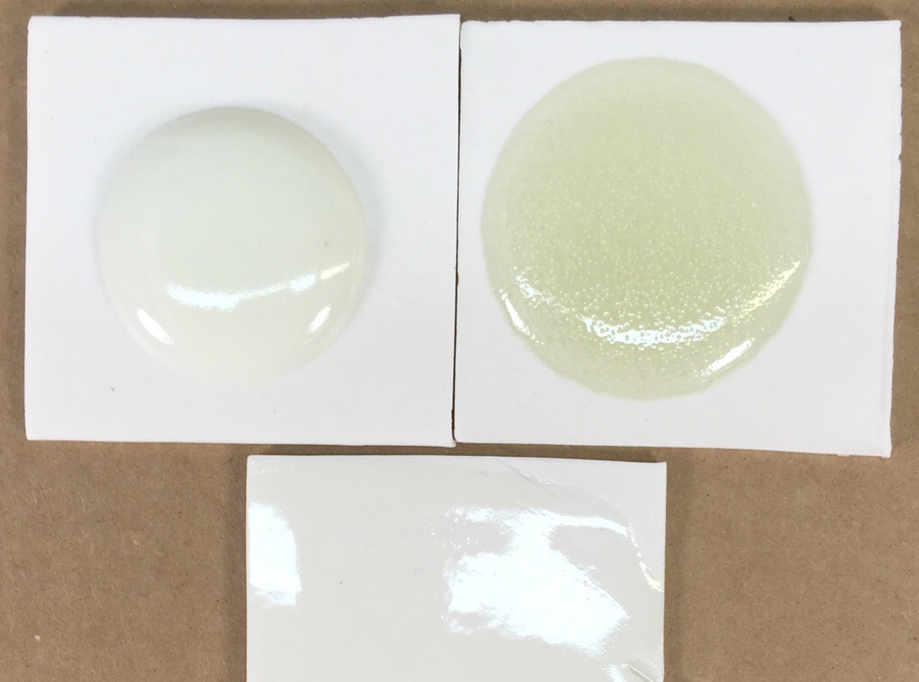 Although this melts well enough to look good on the buff and white burning clays, the melt is stiff enough that lots of bubbles are trapped in the red burning one Fluid cone 6 clear glaze comparison