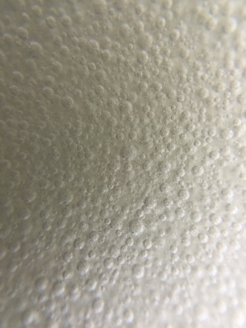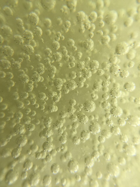 These are 10 gram balls melted down onto a tile to demonstrate fluidity, clarity and bubbling. G3813 16x closeup of entrained bubbles