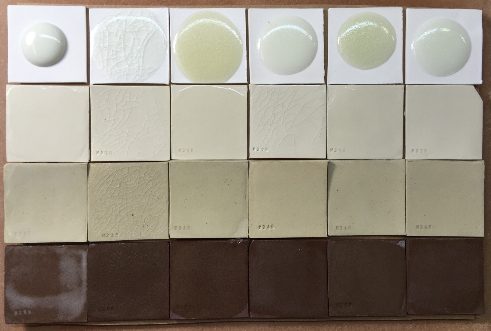 These are 10 gram glaze balls are fired down onto tiles to demonstrate melt fluidity and bubbling. Campana clear on Plainsman M370,340,390