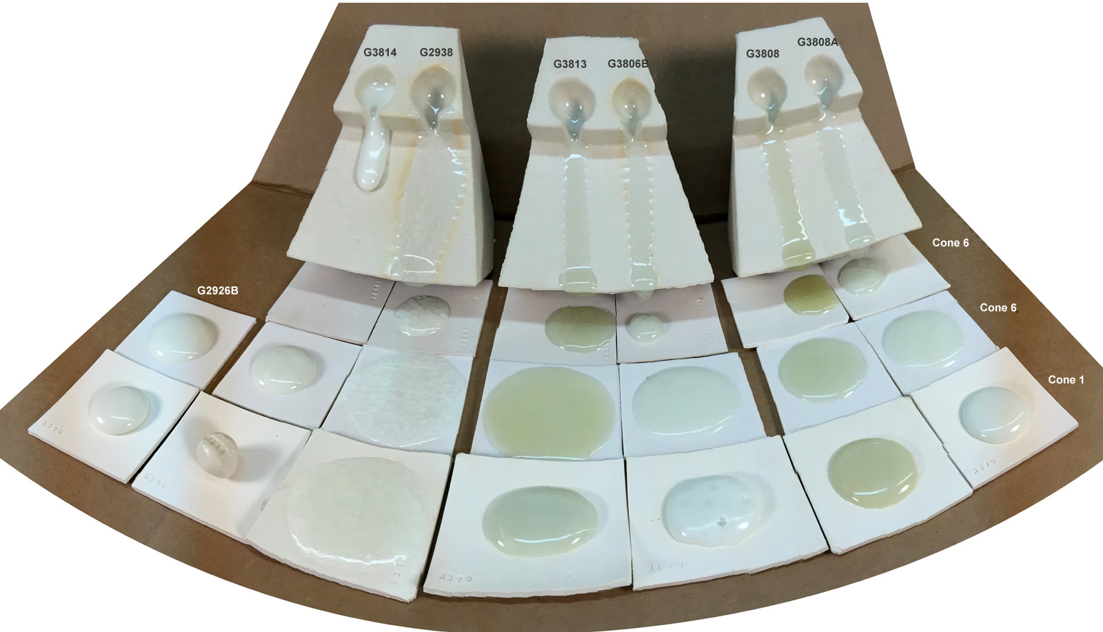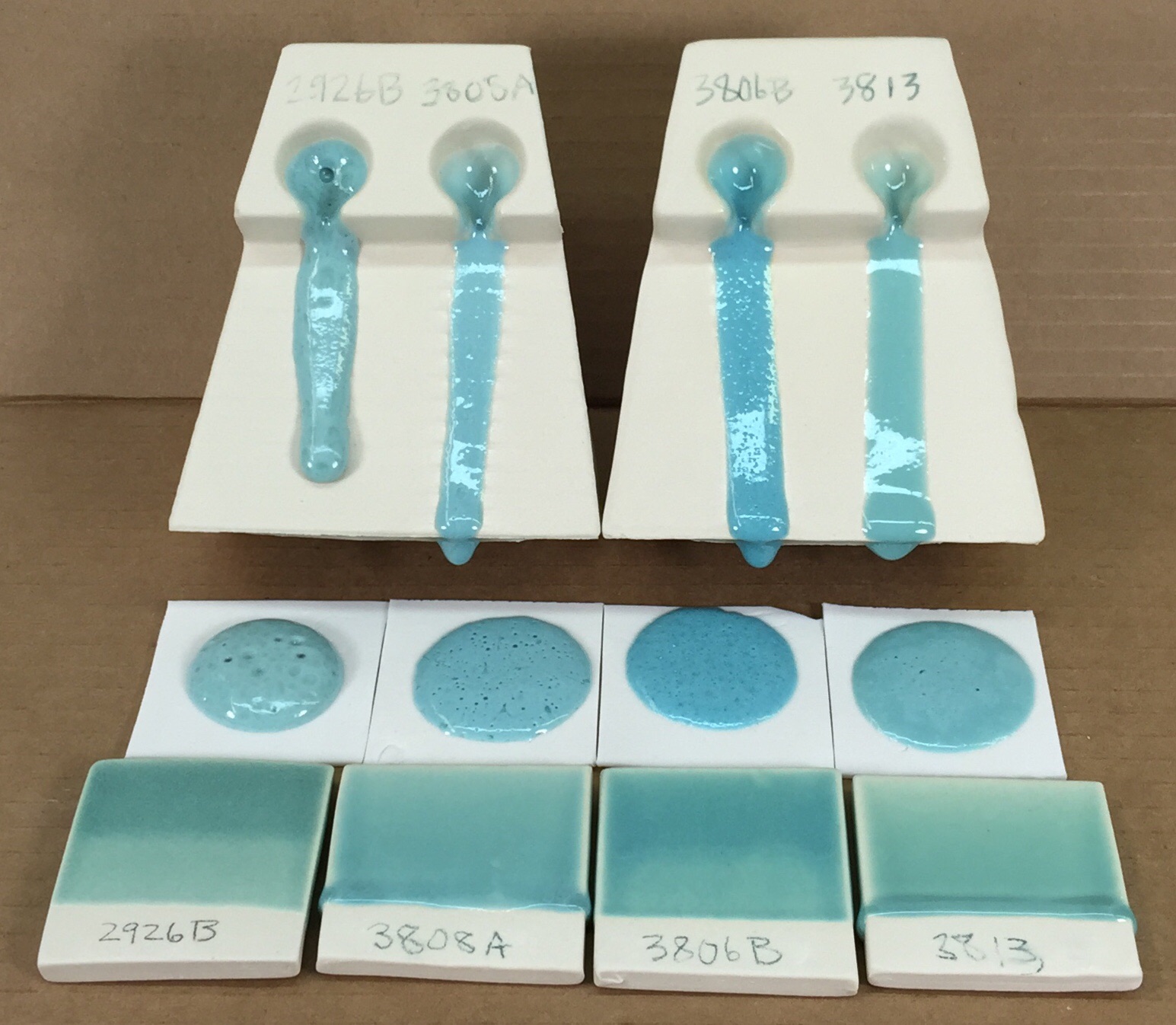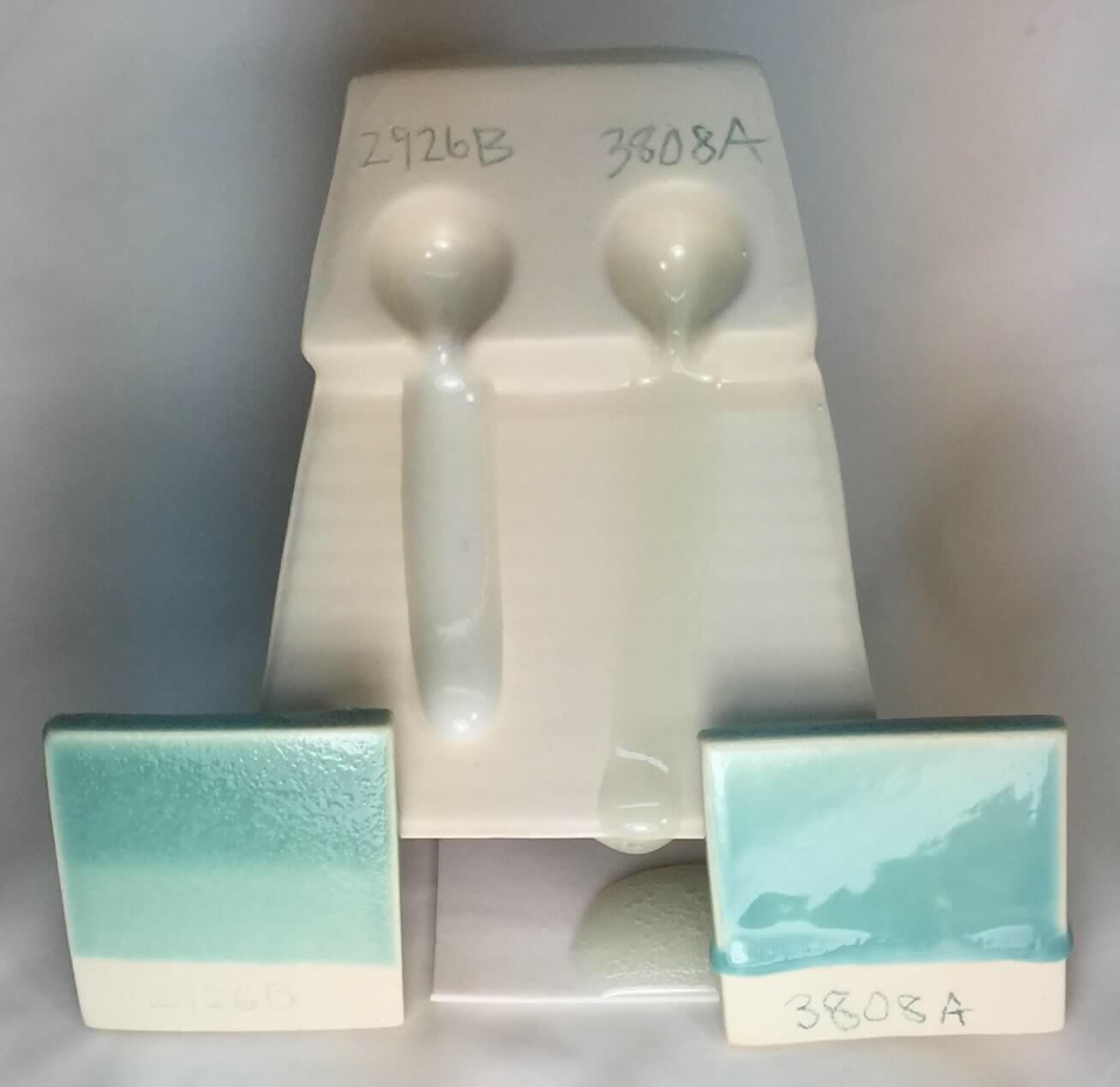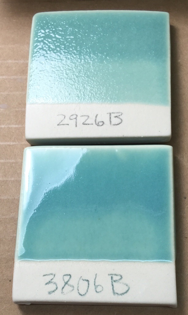 Has extenal picture also The flow testers at the back and the melt-down-balls in from of them have 1% copper carbonate. The glazed samples in the front row have 2% copper carbonate. L3806B, an improvement on the Panama Blue recipe, has the best color and the best compromize of flow and bubble clearing ability. G3808A vs 2926B flow test