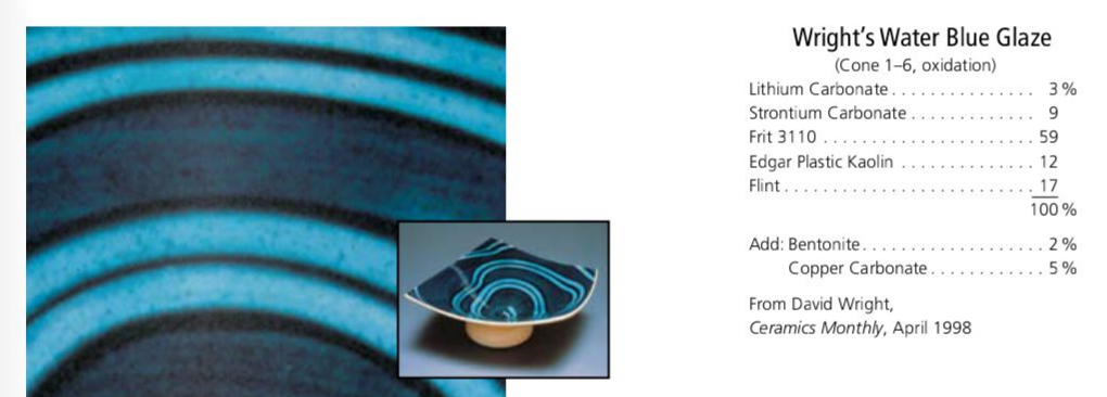 From Vivian Pyle XML (to paste into Insight) <?xml version="1.0"?> <recipes version="1.0" encoding="UTF-8"> <recipe name="Wright&#039;s Water Blue Base" keywords="Cone 6" id="60278" key="PyzbdF1C" date="2024-07-01" codenum="G2938" email="kathryn.kearns@solano.edu"> <recipelines> <recipeline material="Lithium Carbonate" amount="3.000" tolerance=""/> <recipeline material="Strontium Carbonate" amount="9.000" tolerance=""/> <recipeline material="Ferro Frit 3110" amount="59.000" tolerance=""/> <recipeline material="EP Kaolin" amount="12.000" tolerance=""/> <recipeline material="Silica" amount="17.000" tolerance=""/> <recipeline material="Bentonite" amount="2.000" added="true"/> <recipeline material="Copper Carbonate" amount="5.000" added="true"/> </recipelines> </recipe> </recipes> Born: 2014-07-08, Modified: 2024-07-01 13:45:23 |