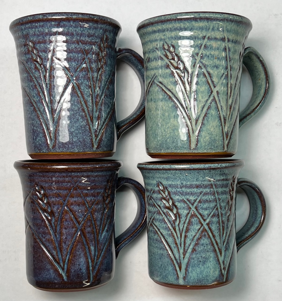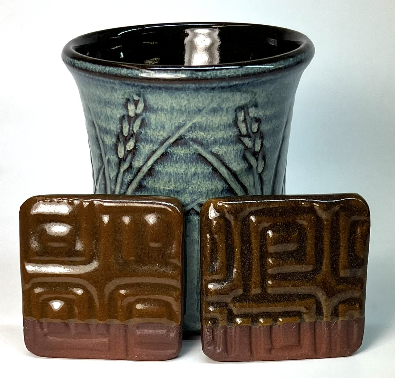 The left mug was fired using our drop-and-soak PLC6DS, the other with the slow-cool C6DHSC schedule. Ravenscrag Floating blue as brushing glaze